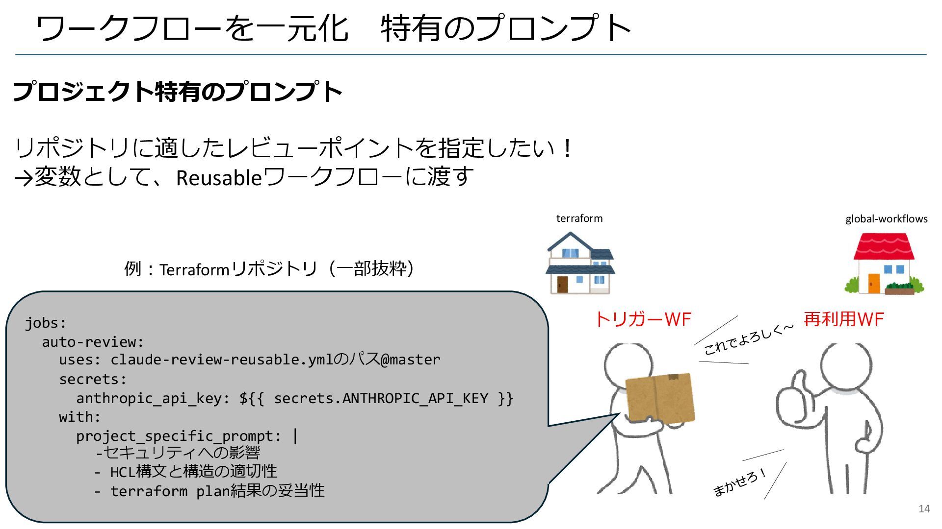 ワークフローを一元化 特有のプロンプト プロジェクト特有のプロンプト リポジトリに適したレビューポイントを指定したい! →変数として、Reusableワークフローに渡す 例:Terraformリポジトリ(一部抜粋) jobs: auto-review: uses: claude-review-reusable.ymlのパス@master