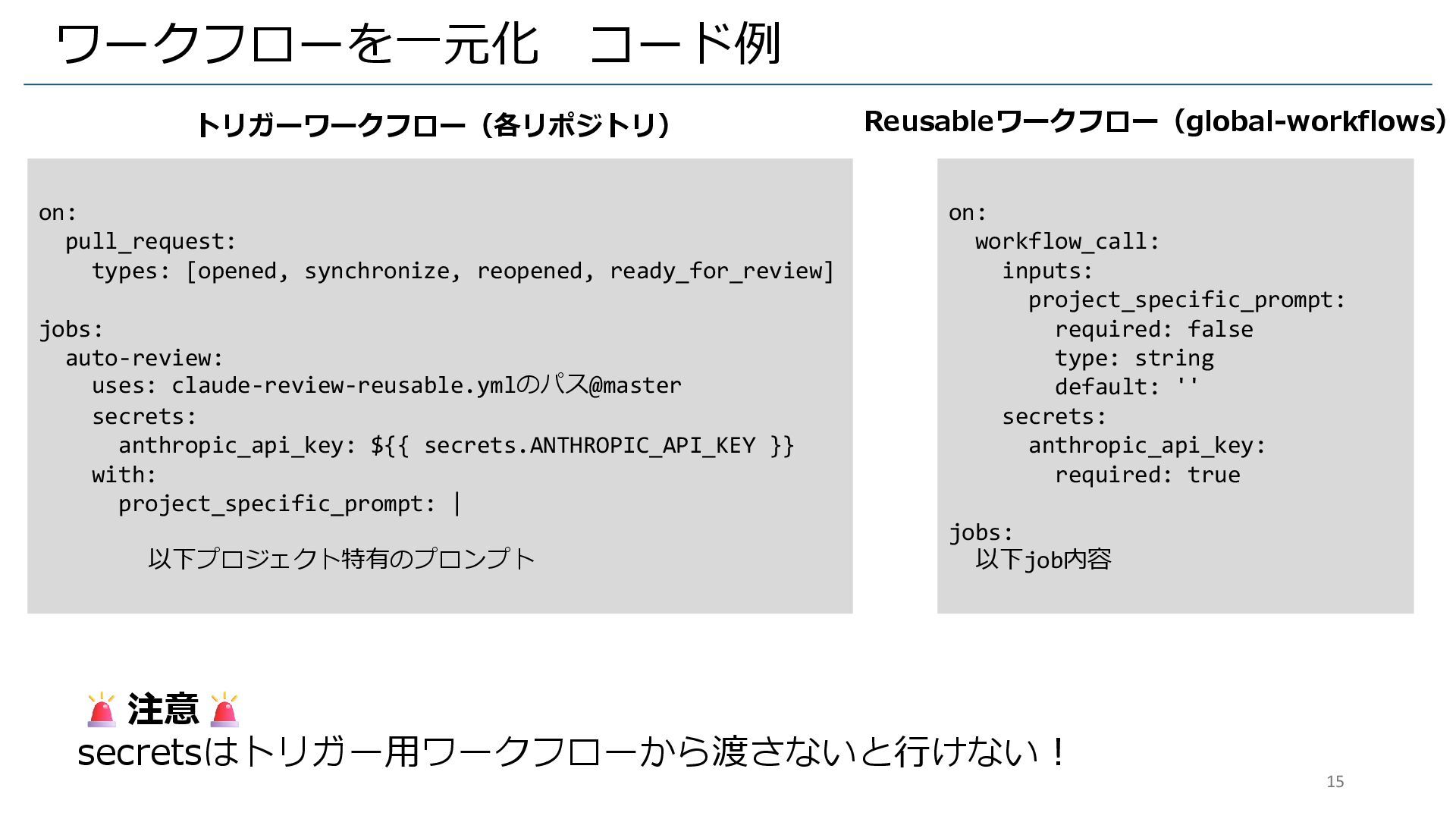 auto-review: uses: claude-review-reusable.ymlのパス@master secrets: anthropic_api_key: ${{ secrets.ANTHROPIC_API_KEY }} with: project_specific_prompt: | 以下プロジェクト特有のプロンプト on: workflow_call: inputs: project_specific_prompt: required: false type: string default: '' secrets: anthropic_api_key: required: true jobs: 以下job内容 Reusableワークフロー(global-workflows) トリガーワークフロー(各リポジトリ) 注意 secretsはトリガー用ワークフローから渡さないと行けない! 15