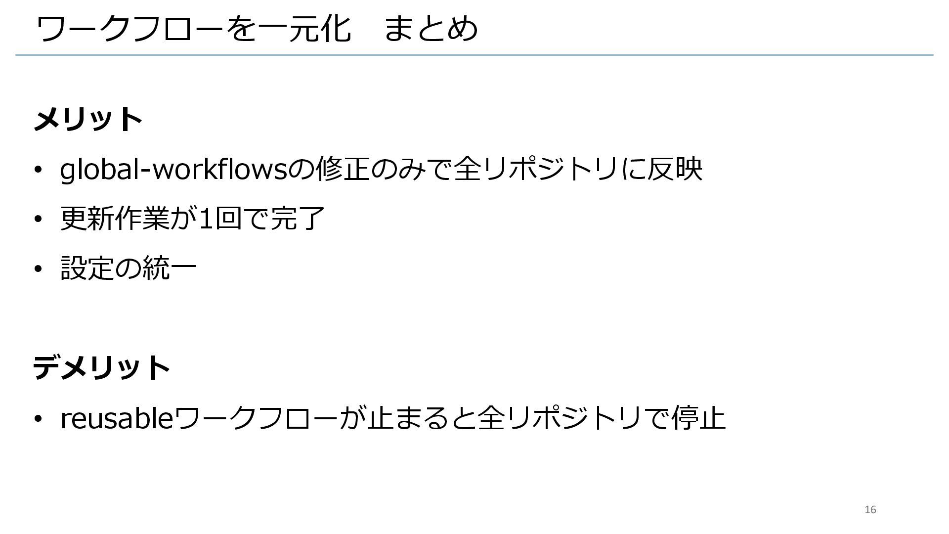 • reusableワークフローが止まると全リポジトリで停止 16