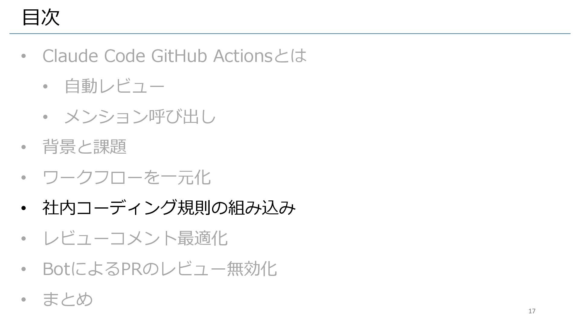 • 背景と課題 • ワークフローを一元化 • 社内コーディング規則の組み込み • レビューコメント最適化 • BotによるPRのレビュー無効化 • まとめ 17