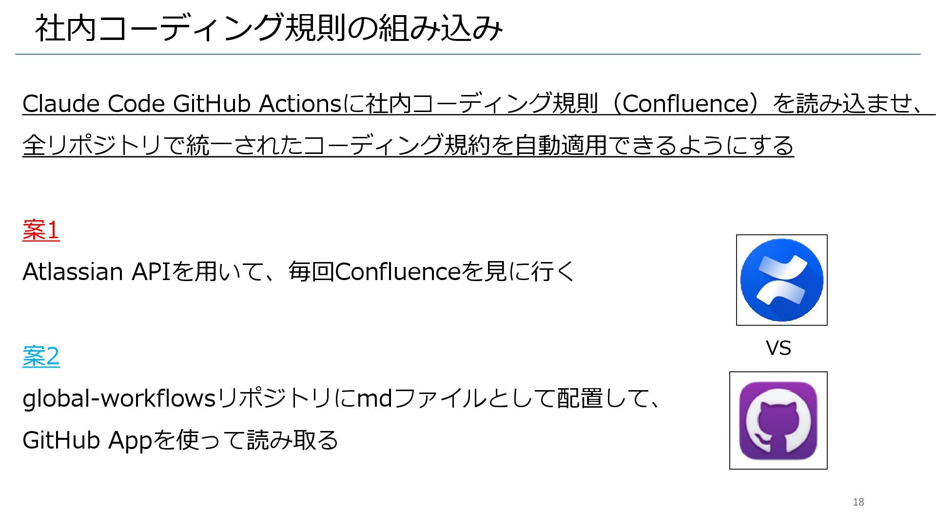社内コーディング規則の組み込み Claude Code GitHub Actionsに社内コーディング規則(Confluence)を読み込ませ、 全リポジトリで統一されたコーディング規約を自動適用できるようにする 案1 Atlassian APIを用いて、毎回Confluenceを見に行く 案2