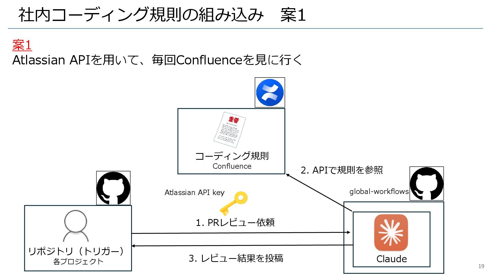 1. PRレビュー依頼 Atlassian API key 2. APIで規則を参照 3. レビュー結果を投稿 global-workflows 19