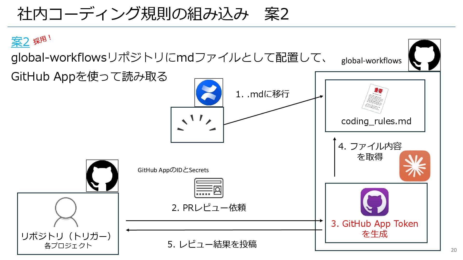1. .mdに移行 5. レビュー結果を投稿 coding_rules.md global-workflows 3. GitHub App Token を生成 20 4. ファイル内容 を取得 GitHub AppのIDとSecrets