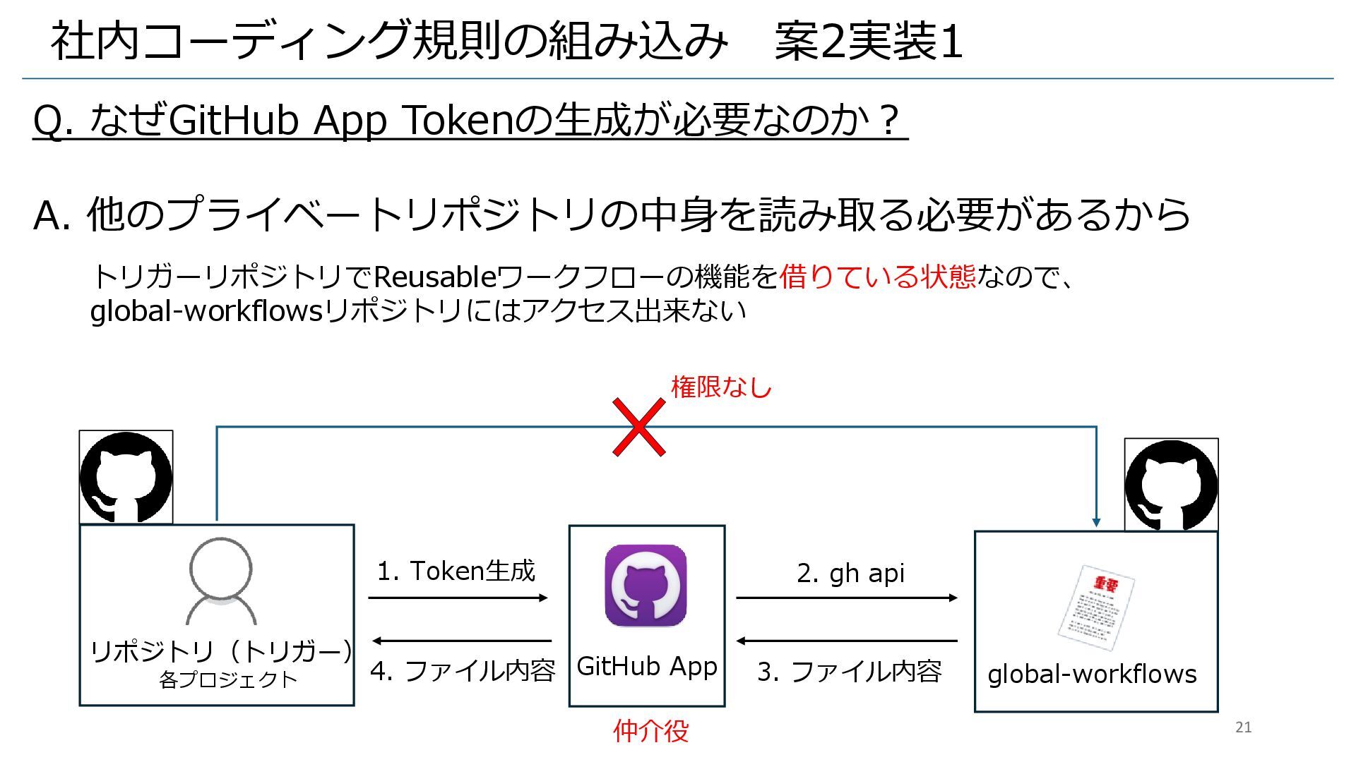 global-workflowsリポジトリにはアクセス出来ない リポジトリ(トリガー) 各プロジェクト GitHub App global-workflows 権限なし 1. Token生成 2. gh api 3. ファイル内容 4. ファイル内容 仲介役