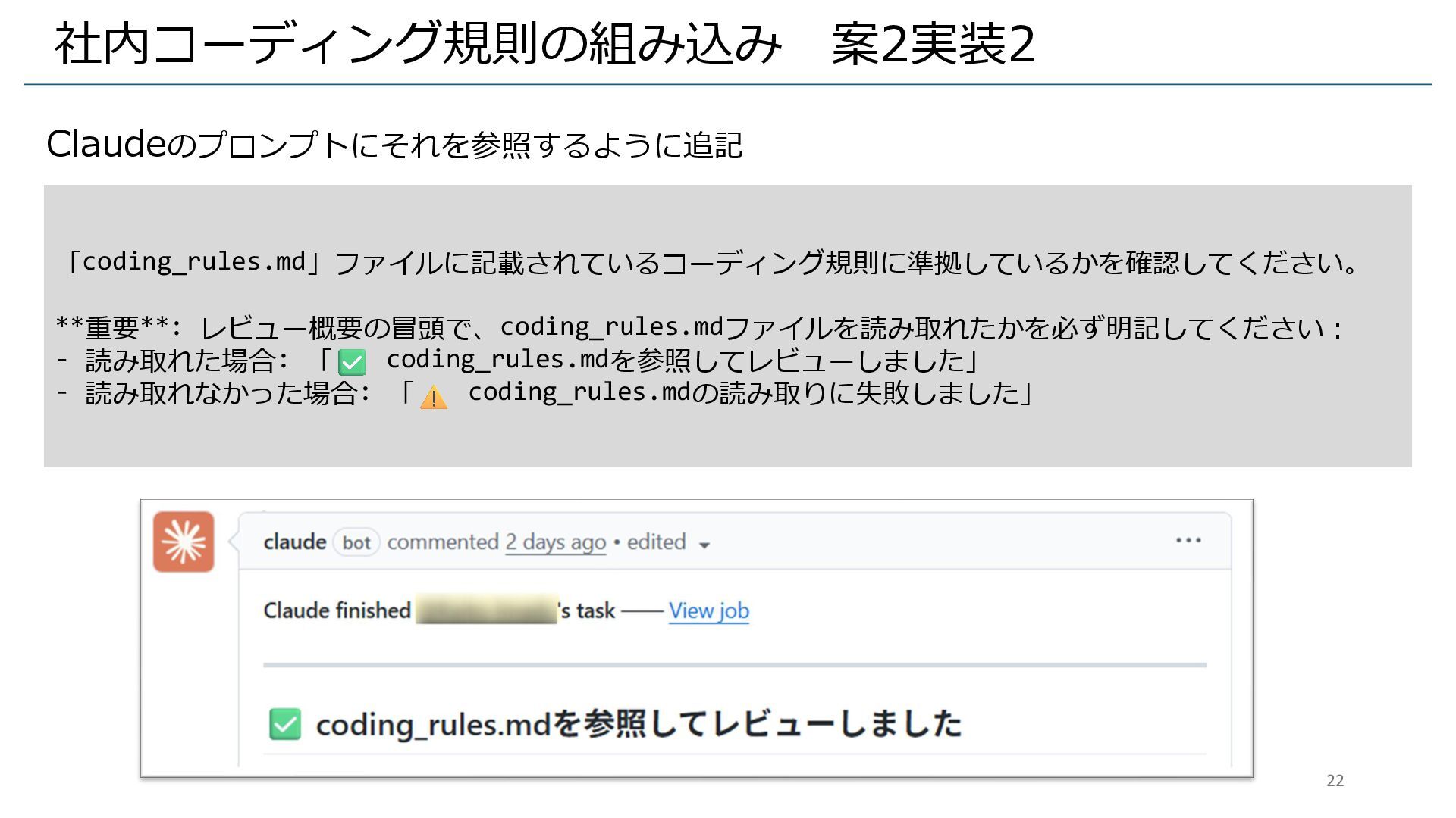 - 読み取れなかった場合: 「 coding_rules.mdの読み取りに失敗しました」 22