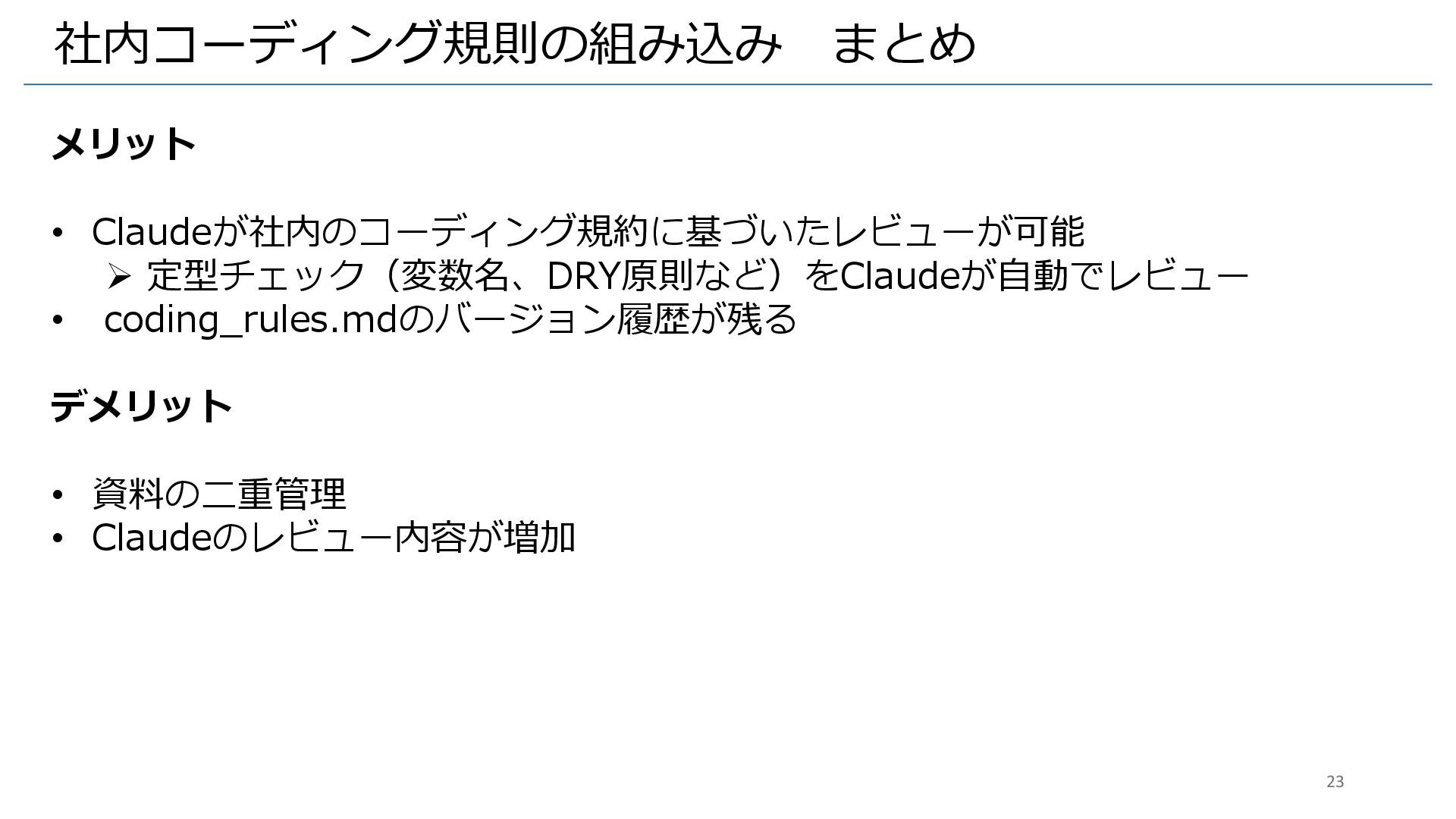 社内コーディング規則の組み込み まとめ メリット • Claudeが社内のコーディング規約に基づいたレビューが可能 ➢ 定型チェック(変数名、DRY原則など)をClaudeが自動でレビュー • coding_rules.mdのバージョン履歴が残る デメリット
