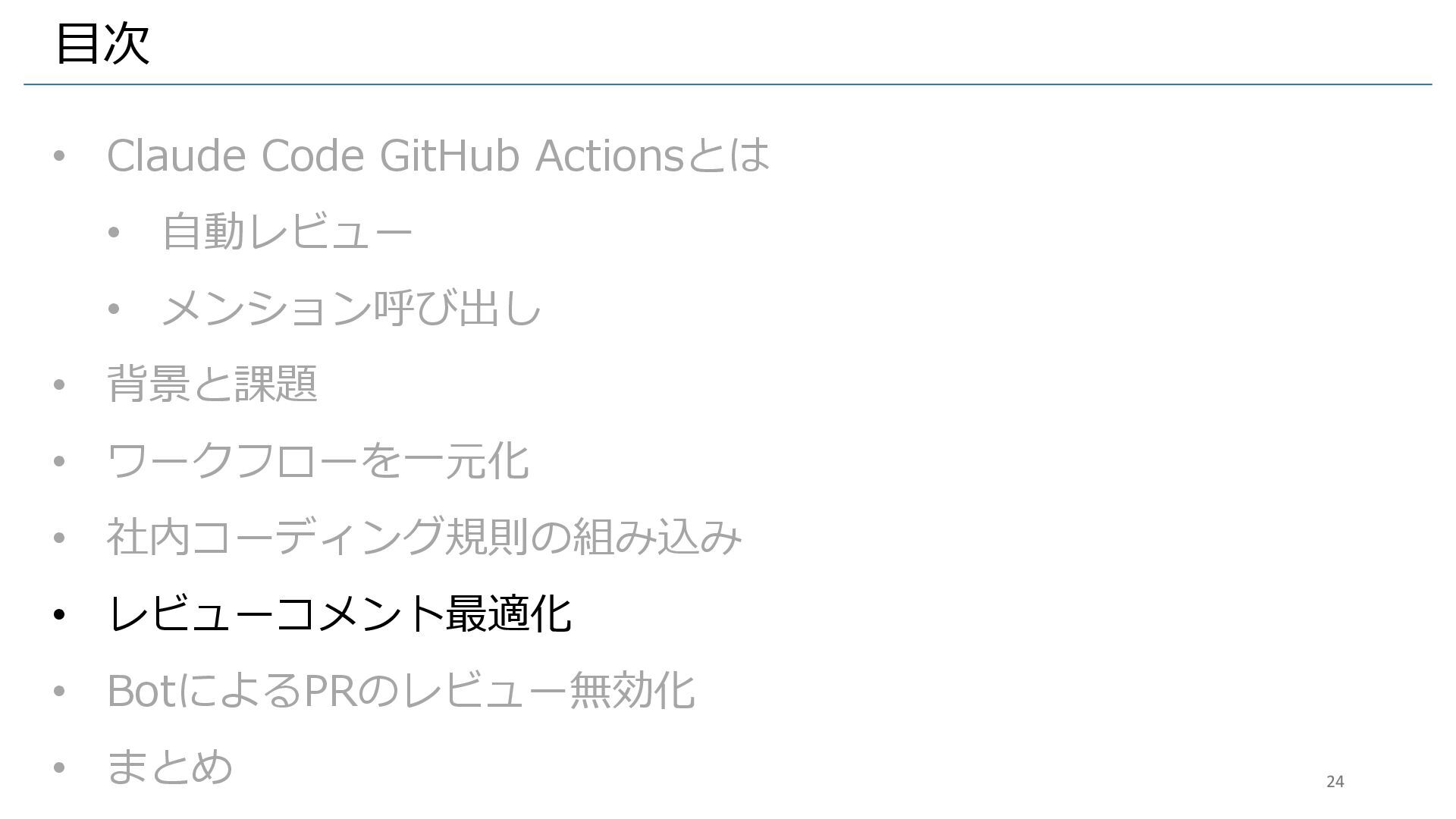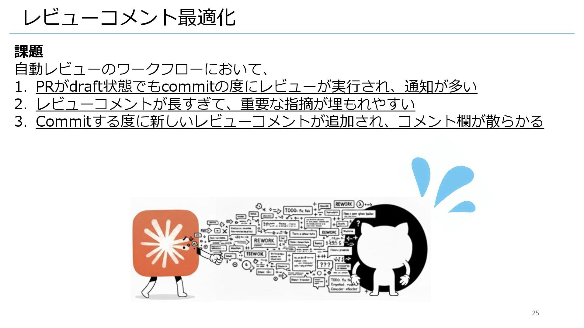 • 背景と課題 • ワークフローを一元化 • 社内コーディング規則の組み込み • レビューコメント最適化 • BotによるPRのレビュー無効化 • まとめ 24