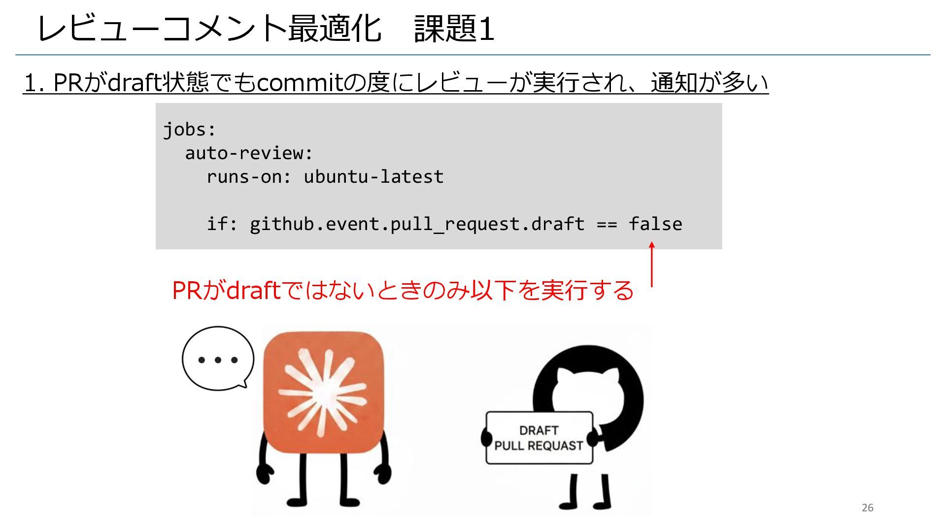 レビューコメント最適化 課題1 1. PRがdraft状態でもcommitの度にレビューが実行され、通知が多い jobs: auto-review: runs-on: ubuntu-latest if: github.event.pull_request.draft