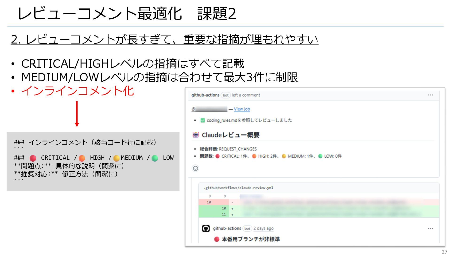 レビューコメント最適化 課題2 2. レビューコメントが長すぎて、重要な指摘が埋もれやすい • CRITICAL/HIGHレベルの指摘はすべて記載 • MEDIUM/LOWレベルの指摘は合わせて最大3件に制限 • インラインコメント化
