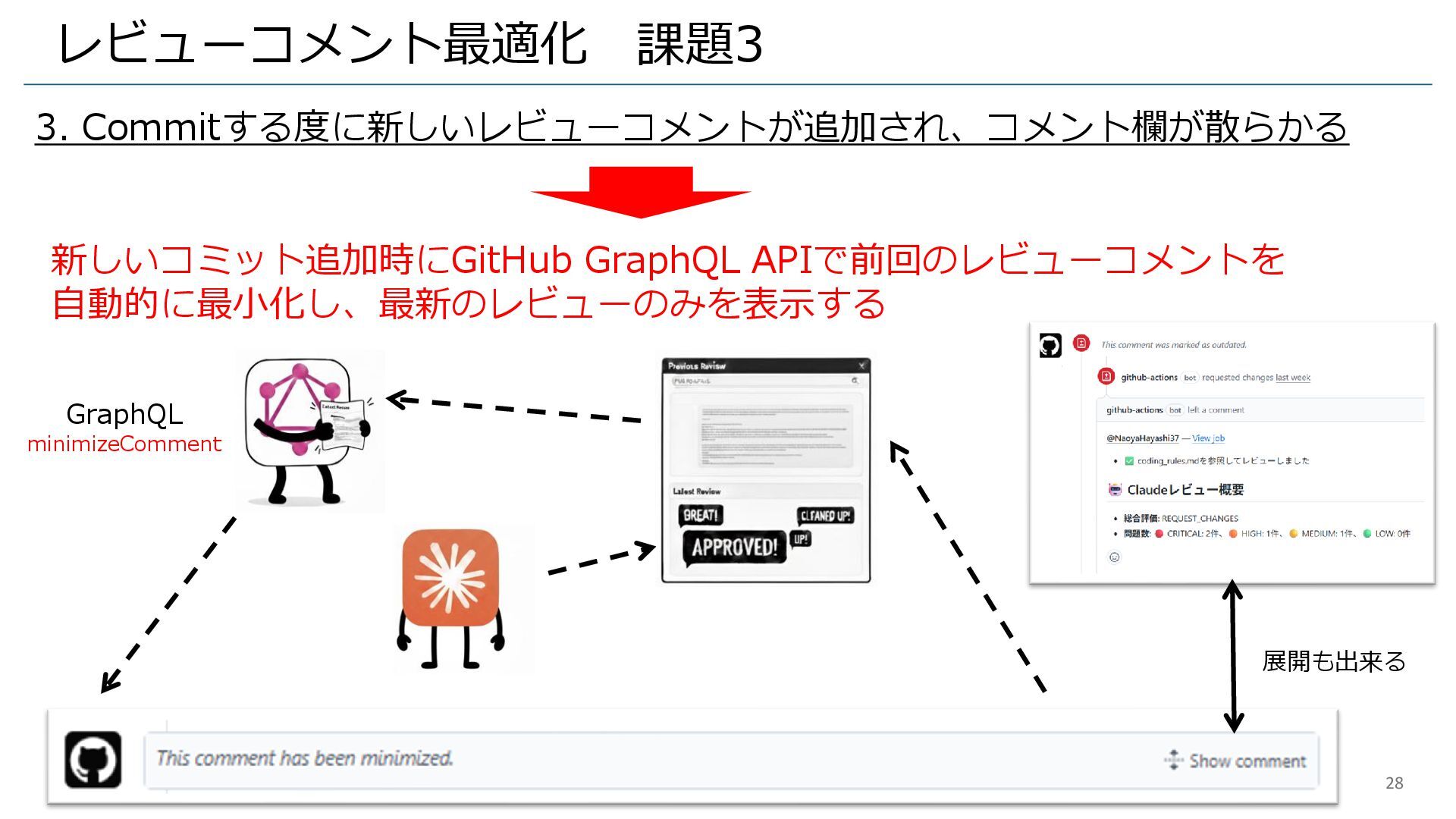 レビューコメント最適化 課題3 3. Commitする度に新しいレビューコメントが追加され、コメント欄が散らかる 新しいコミット追加時にGitHub GraphQL APIで前回のレビューコメントを 自動的に最小化し、最新のレビューのみを表示する GraphQL minimizeComment