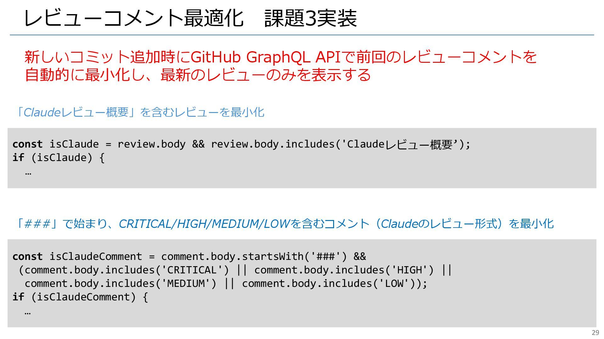 && review.body.includes('Claudeレビュー概要’); if (isClaude) { … 「Claudeレビュー概要」を含むレビューを最小化 const isClaudeComment = comment.body.startsWith('###') && (comment.body.includes('CRITICAL') || comment.body.includes('HIGH') || comment.body.includes('MEDIUM') || comment.body.includes('LOW')); if (isClaudeComment) { … 「###」で始まり、CRITICAL/HIGH/MEDIUM/LOWを含むコメント(Claudeのレビュー形式)を最小化 29