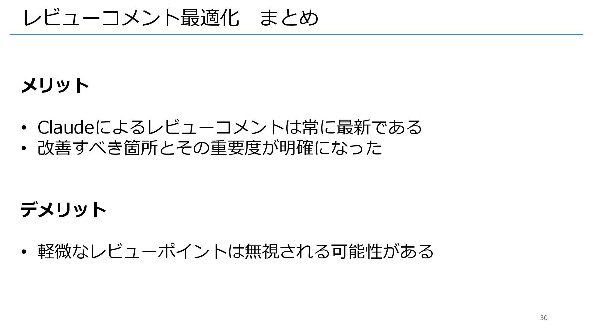 レビューコメント最適化 まとめ メリット • Claudeによるレビューコメントは常に最新である • 改善すべき箇所とその重要度が明確になった デメリット • 軽微なレビューポイントは無視される可能性がある