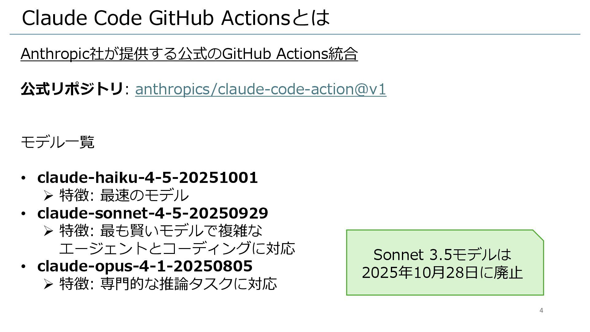 Claude Code GitHub Actionsとは Anthropic社が提供する公式のGitHub Actions統合 公式リポジトリ: anthropics/claude-code-action@v1 モデル一覧 •