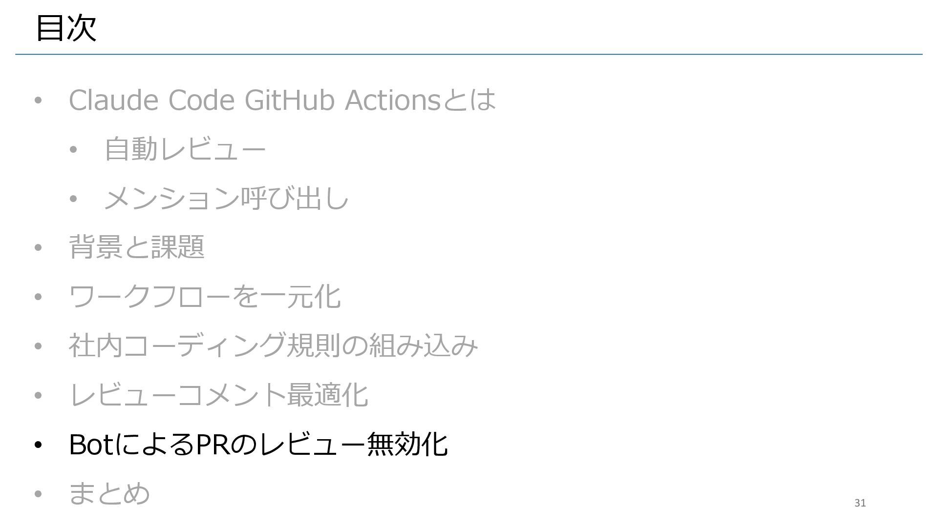 • 背景と課題 • ワークフローを一元化 • 社内コーディング規則の組み込み • レビューコメント最適化 • BotによるPRのレビュー無効化 • まとめ 31
