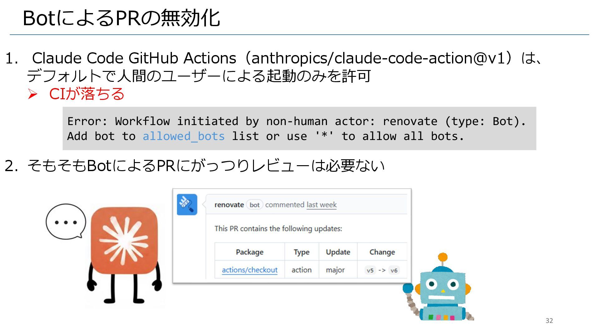 BotによるPRの無効化 1. Claude Code GitHub Actions(anthropics/claude-code-action@v1)は、 デフォルトで人間のユーザーによる起動のみを許可 ➢ CIが落ちる 2.