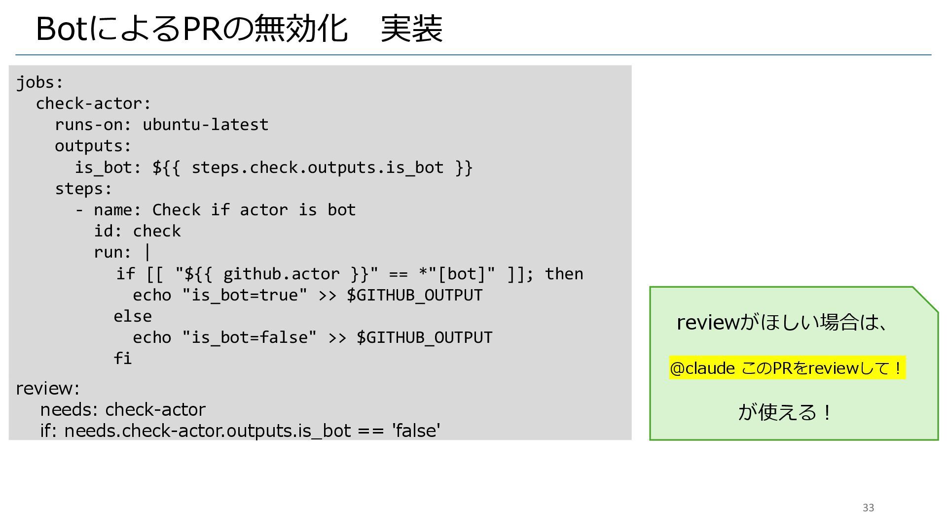 }} steps: - name: Check if actor is bot id: check run: | if [[ "${{ github.actor }}" == *"[bot]" ]]; then echo "is_bot=true" >> $GITHUB_OUTPUT else echo "is_bot=false" >> $GITHUB_OUTPUT fi review: needs: check-actor if: needs.check-actor.outputs.is_bot == 'false' reviewがほしい場合は、 @claude このPRをreviewして! が使える! 33
