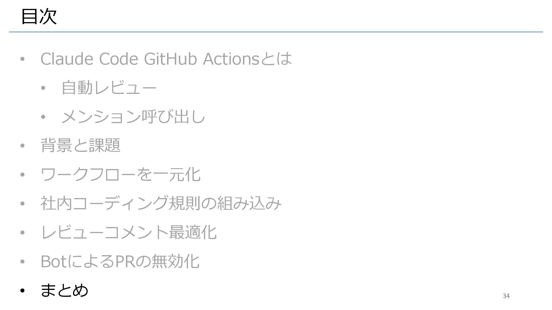 • 背景と課題 • ワークフローを一元化 • 社内コーディング規則の組み込み • レビューコメント最適化 • BotによるPRの無効化 • まとめ 34
