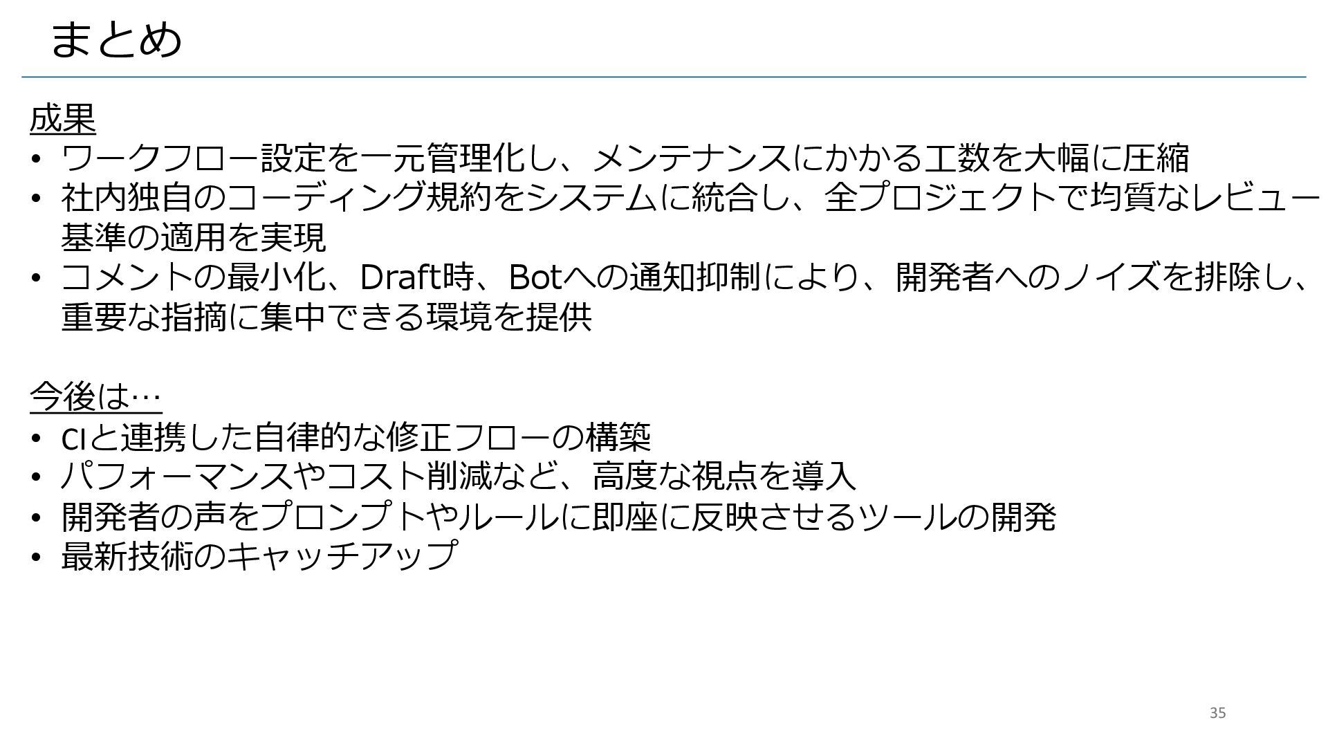 まとめ 成果 • ワークフロー設定を一元管理化し、メンテナンスにかかる工数を大幅に圧縮 • 社内独自のコーディング規約をシステムに統合し、全プロジェクトで均質なレビュー 基準の適用を実現 • コメントの最小化、Draft時、Botへの通知抑制により、開発者へのノイズを排除し、 重要な指摘に集中できる環境を提供