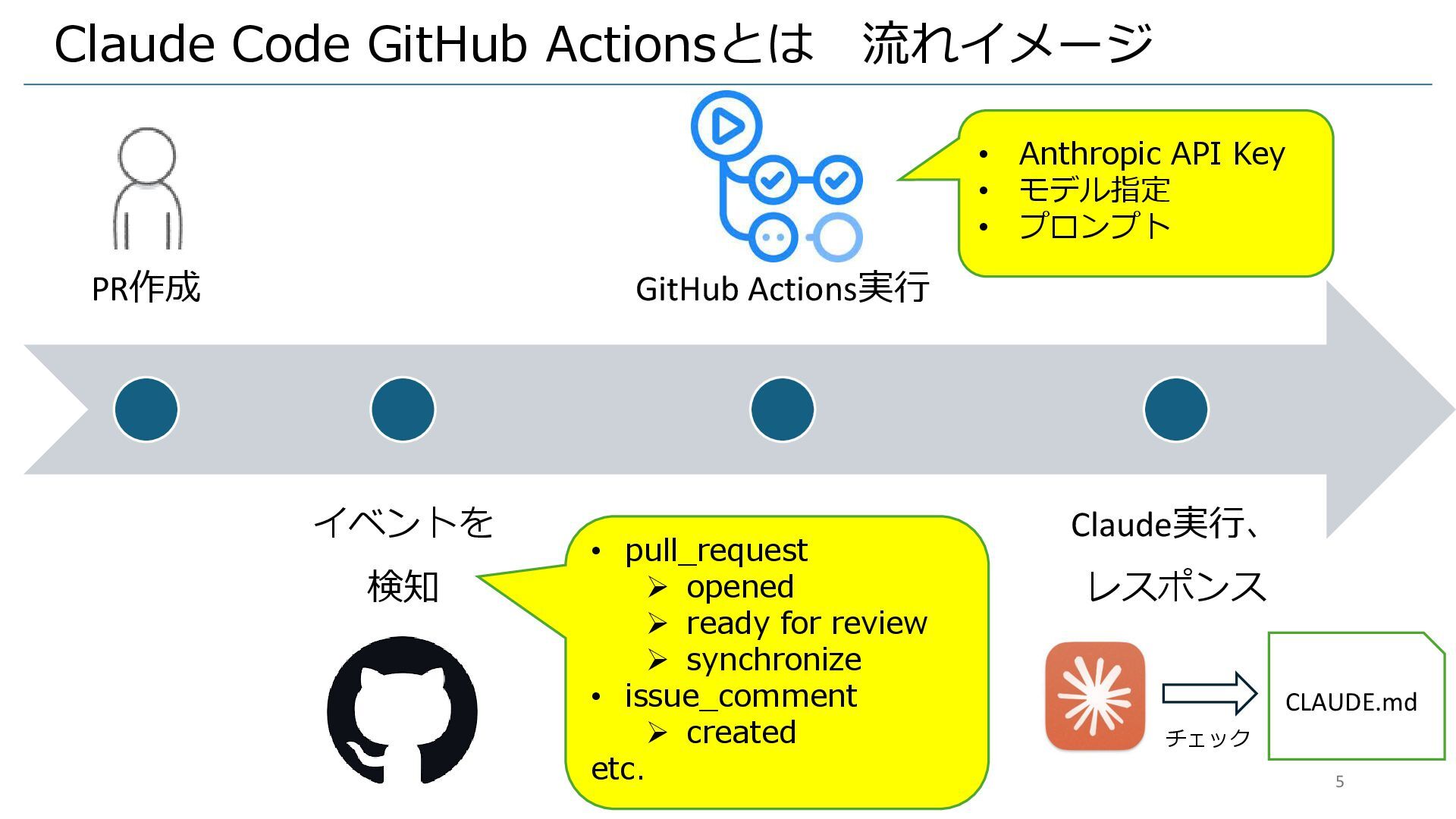Claude Code GitHub Actionsとは 流れイメージ PR作成 イベントを 検知 GitHub Actions実行