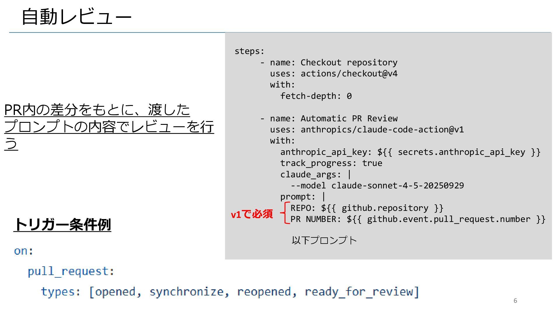 0 - name: Automatic PR Review uses: anthropics/claude-code-action@v1 with: anthropic_api_key: ${{ secrets.anthropic_api_key }} track_progress: true claude_args: | --model claude-sonnet-4-5-20250929 prompt: | REPO: ${{ github.repository }} PR NUMBER: ${{ github.event.pull_request.number }} 以下プロンプト PR内の差分をもとに、渡した プロンプトの内容でレビューを行 う トリガー条件例 v1で必須 6