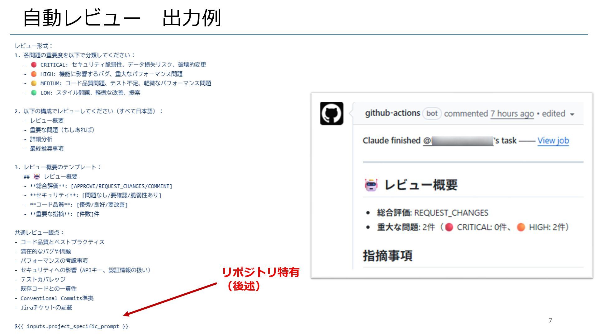 自動レビュー 出力例 リポジトリ特有 (後述) 7
