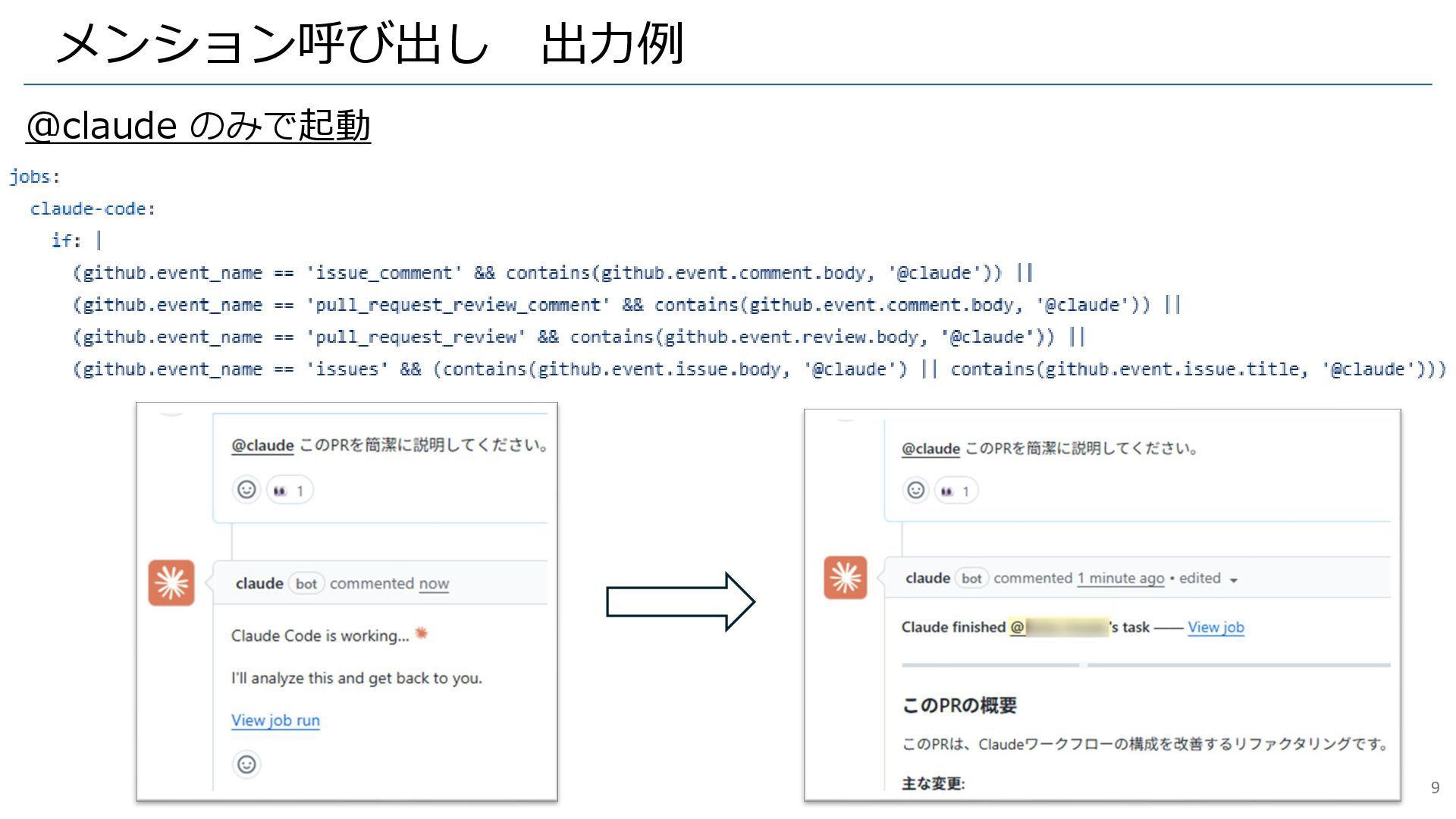 メンション呼び出し 出力例 @claude のみで起動 9