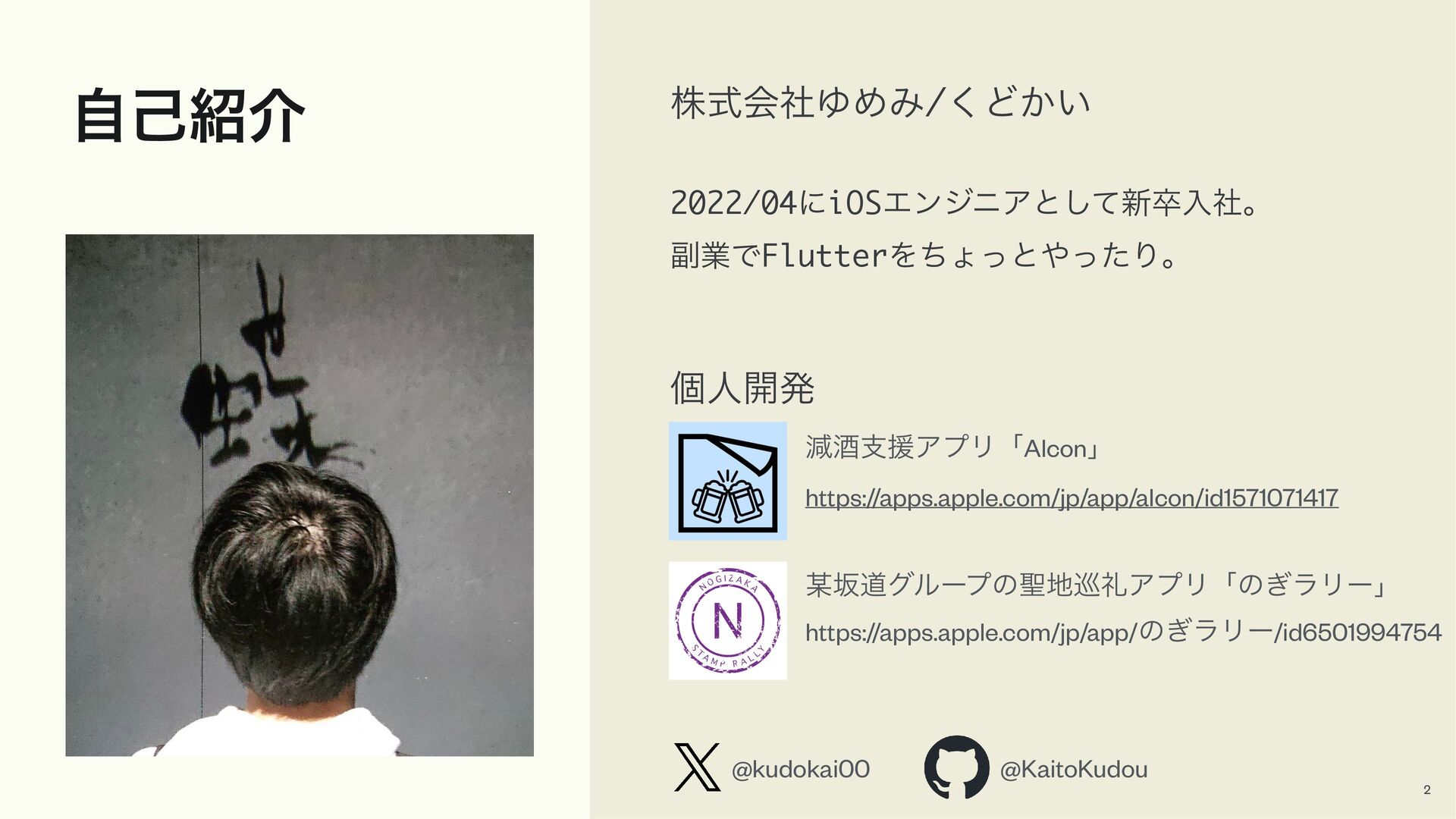 ࣗݾհ גࣜձࣾΏΊΈ/͘Ͳ͔͍ 2022/04ʹiOSΤϯδχΞͱͯ͠৽ଔೖࣾɻ ෭ۀͰFlutterΛͪΐͬͱͬͨΓɻ ݸਓ։ൃ ݮञࢧԉΞϓϦʮAlconʯ https://apps.apple.com/jp/app/alcon/id1571071417 ࡔಓάϧʔϓͷ८ྱΞϓϦʮͷ͗ϥϦʔʯ https://apps.apple.com/jp/app/ͷ͗ϥϦʔ/id6501994754 @kudokai00
