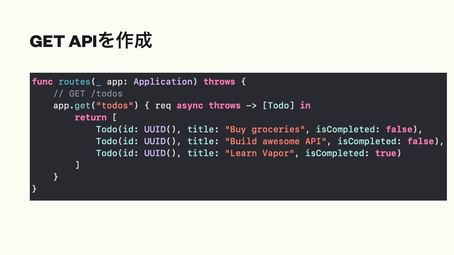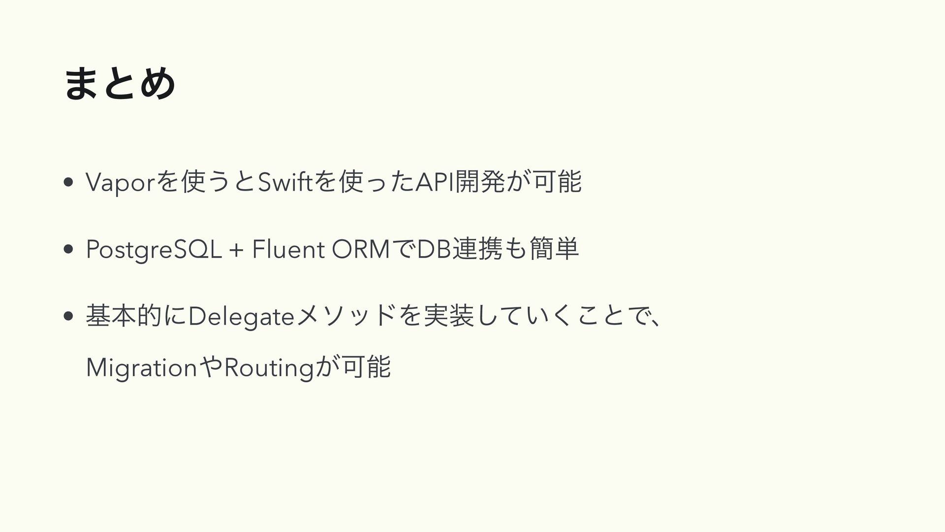 ·ͱΊ • VaporΛ͏ͱSwiftΛͬͨAPI։ൃ͕Մೳ • PostgreSQL + Fluent ORMͰDB࿈ܞ؆୯ • جຊతʹDelegateϝιουΛ࣮͍ͯ͘͜͠ͱͰɺɹɹɹɹɹ