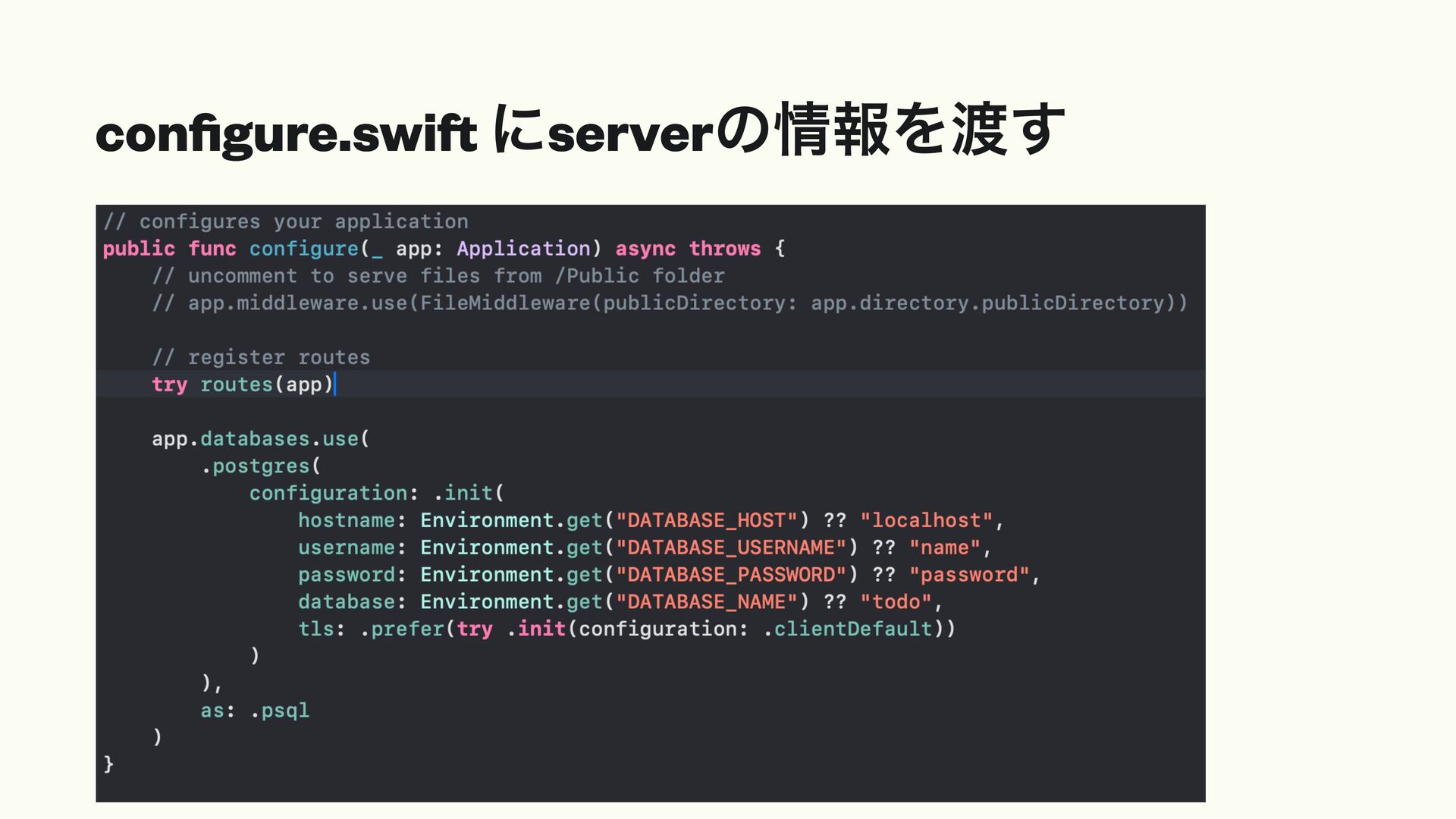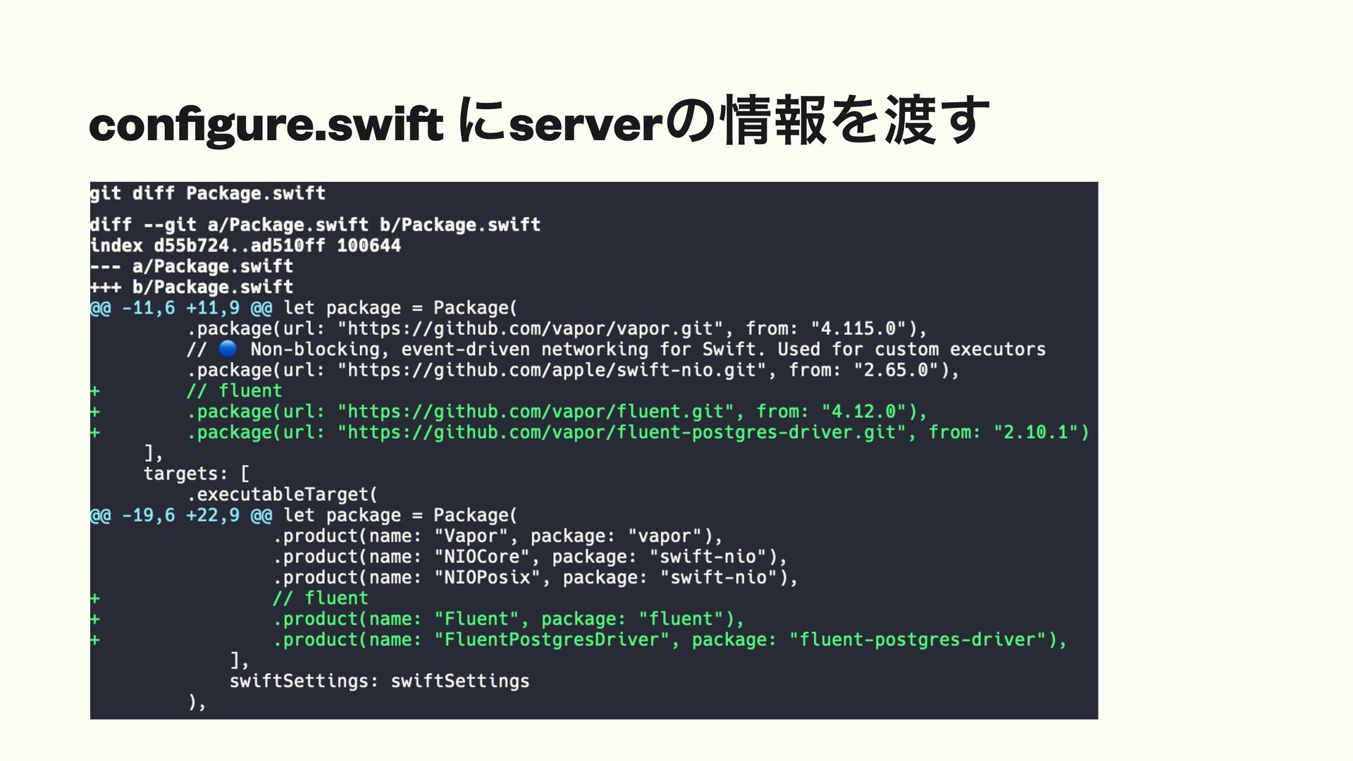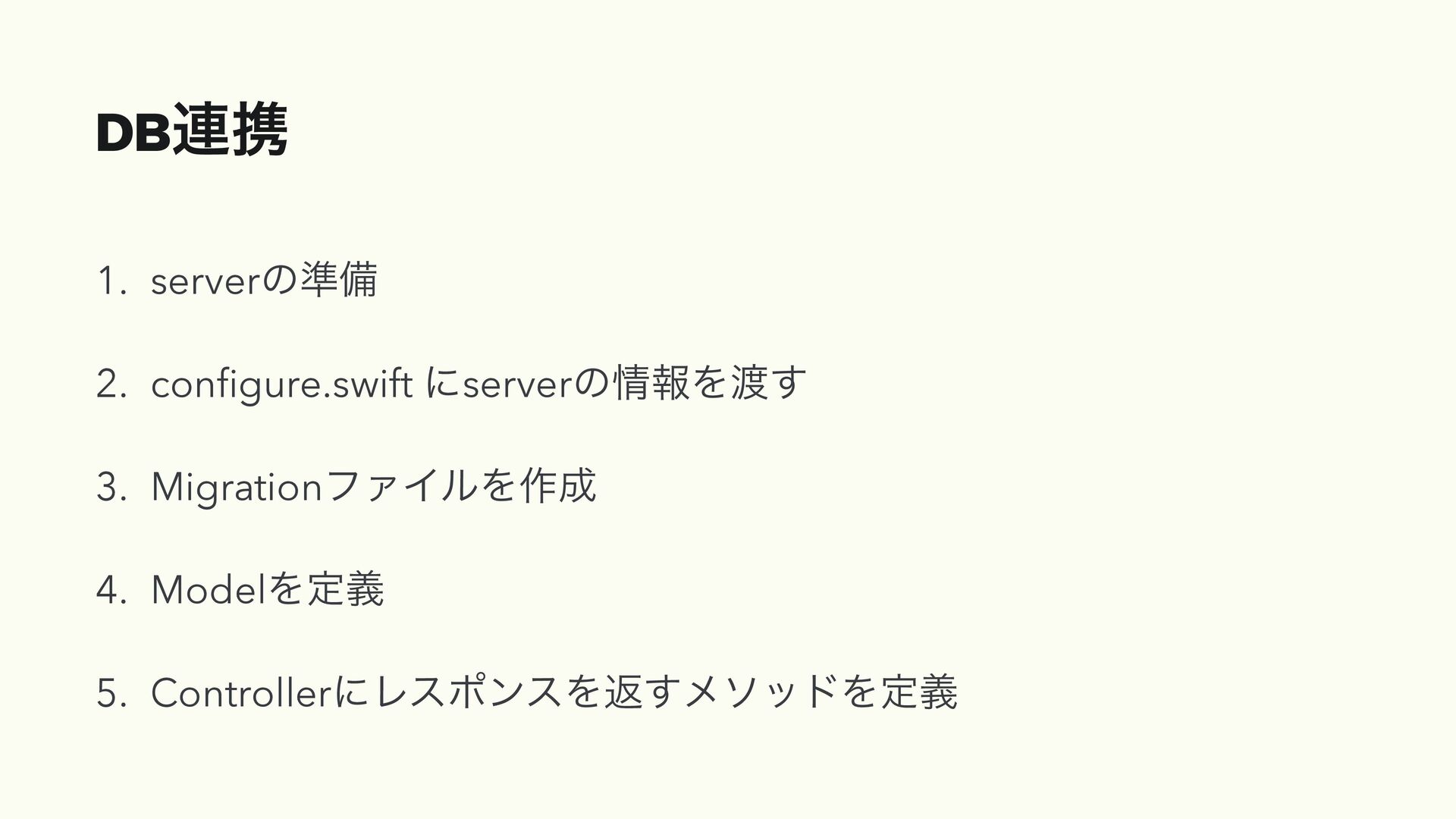 DB࿈ܞ 1. serverͷ४උ 2. con fi gure.swift ʹserverͷใΛ͢ 3. MigrationϑΝΠϧΛ࡞
