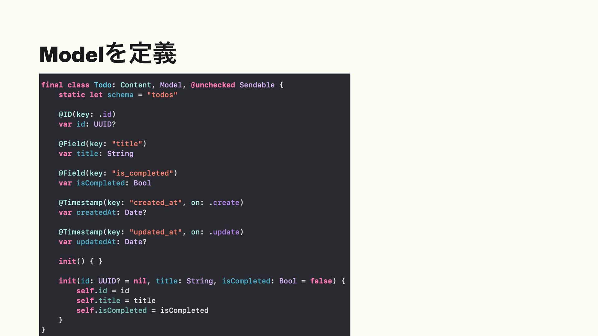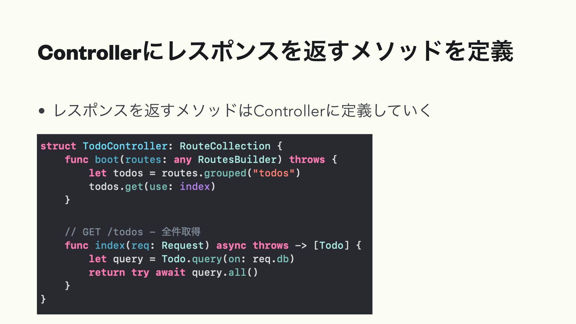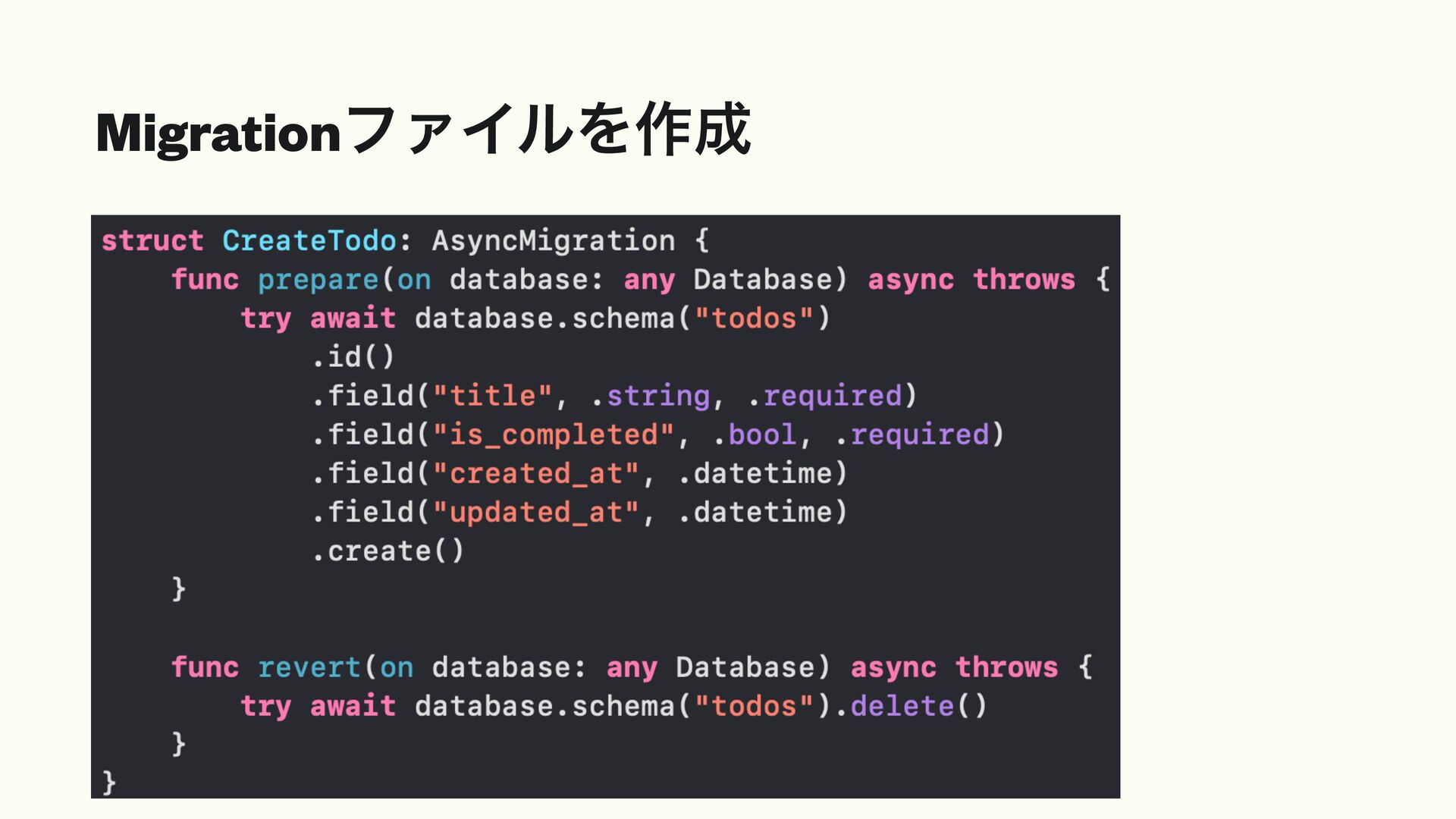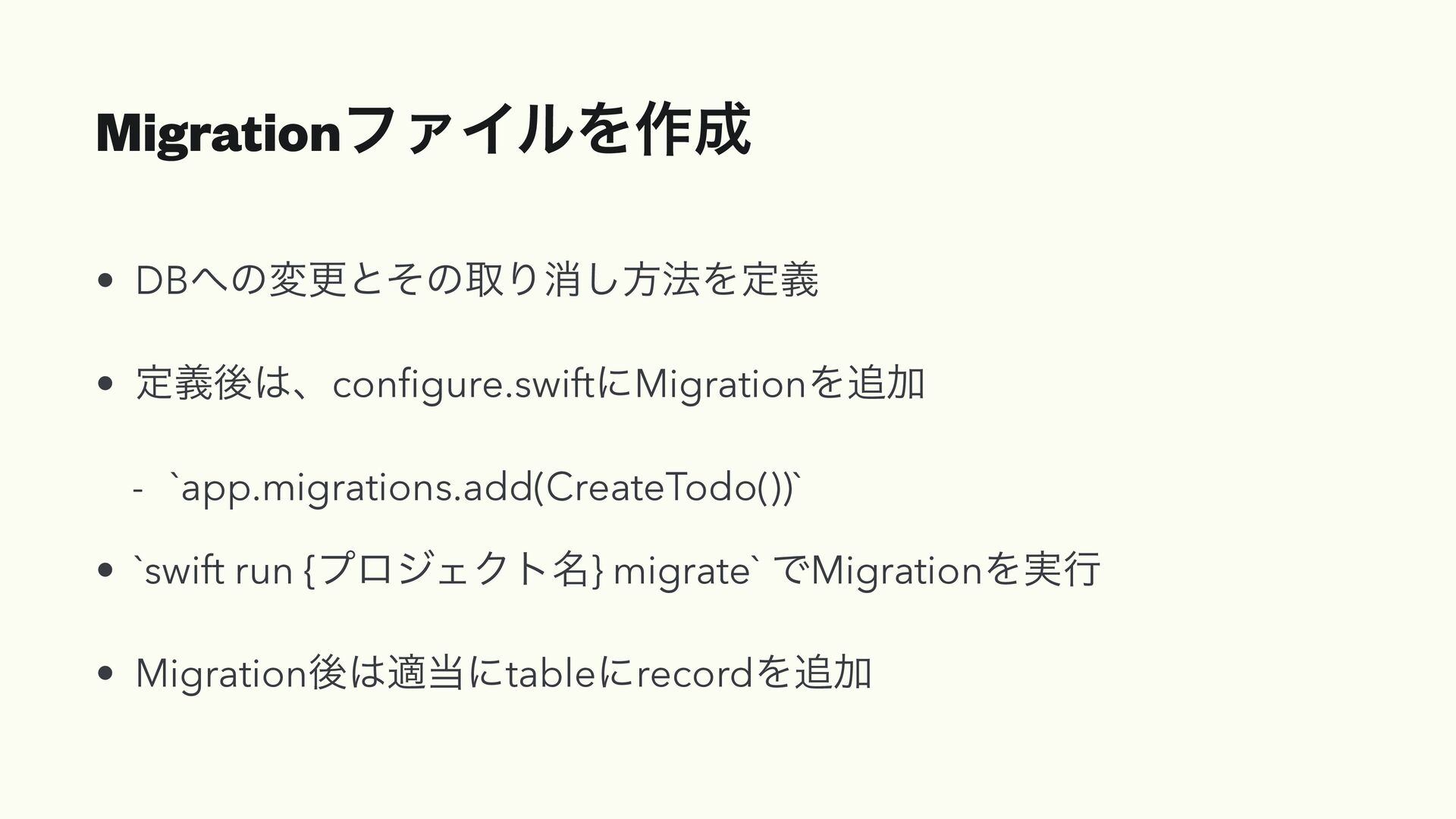 MigrationϑΝΠϧΛ࡞ • DBͷมߋͱͦͷऔΓফ͠ํ๏Λఆٛ • ఆٛޙɺcon fi gure.swiftʹMigrationΛՃ - `app.migrations.add(CreateTodo())` •