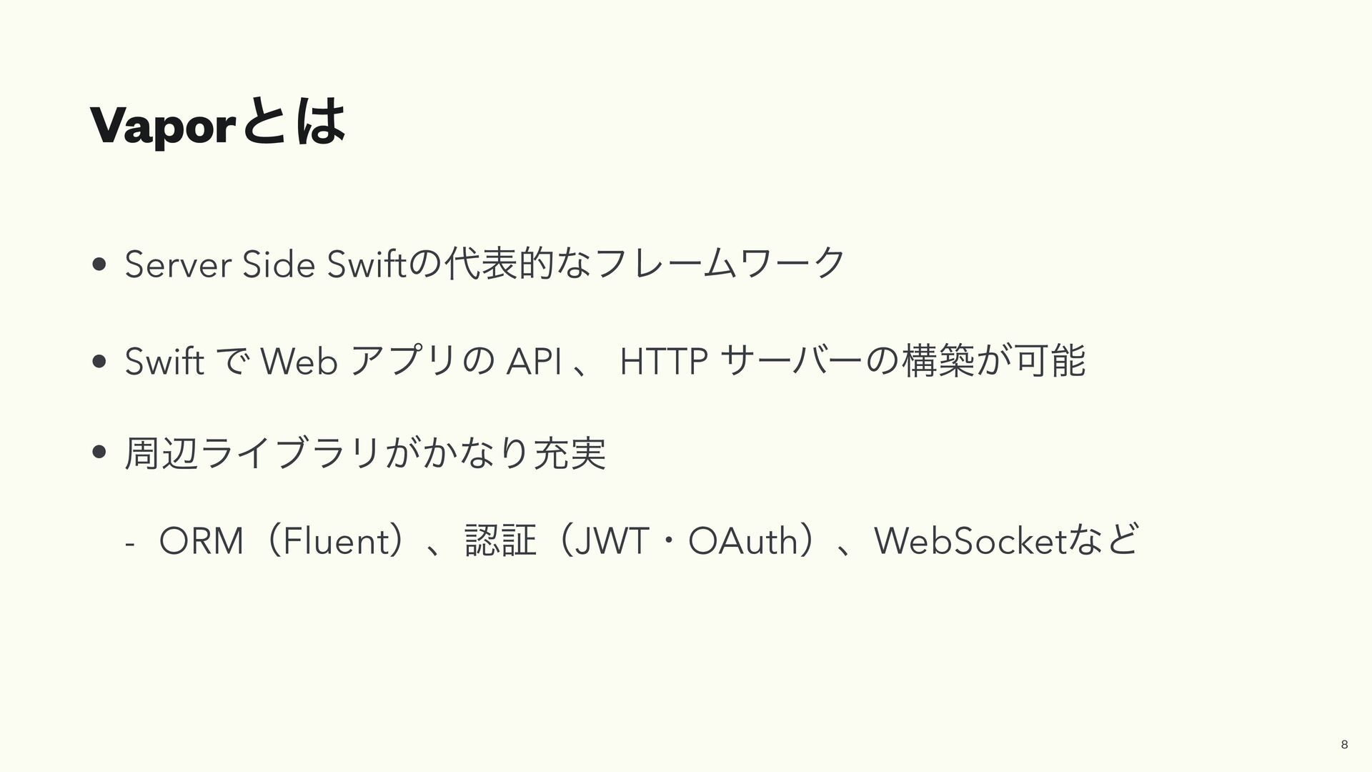 API ɺ HTTP αʔόʔͷߏங͕Մೳ • पลϥΠϒϥϦ͕͔ͳΓॆ࣮ - ORMʢFluentʣɺೝূʢJWTɾOAuthʣɺWebSocketͳͲ 8