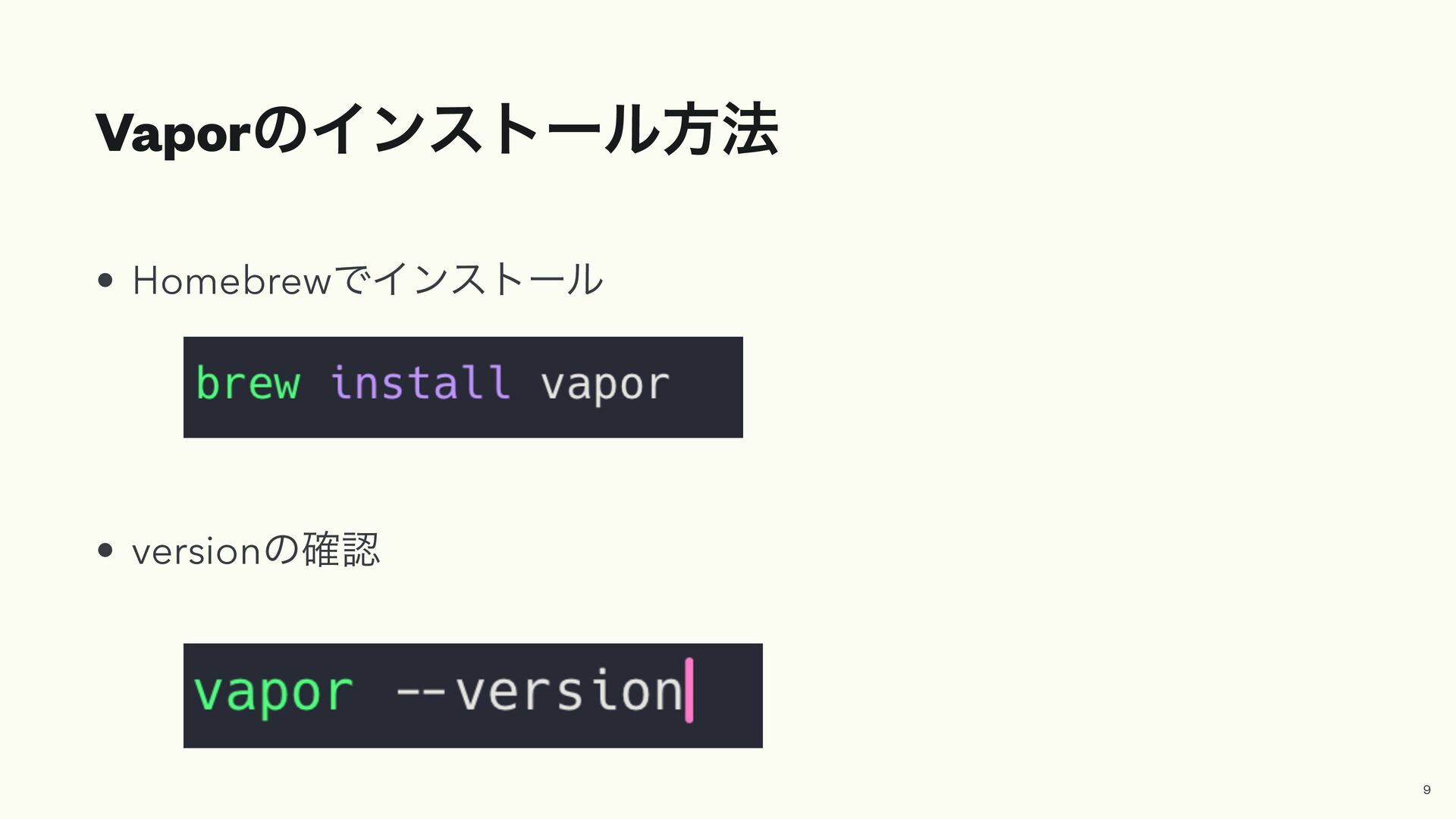 VaporͷΠϯετʔϧํ๏ • HomebrewͰΠϯετʔϧ • versionͷ֬ೝ 9