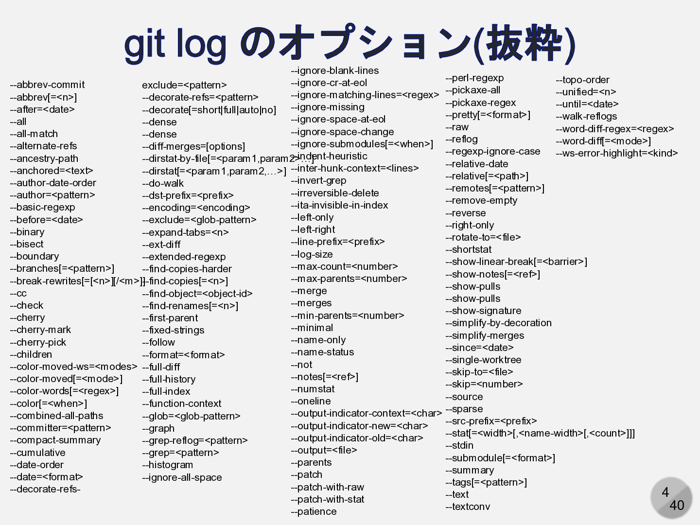 --alternate-refs --ancestry-path --anchored=<text> --author-date-order --author=<pattern> --basic-regexp --before=<date> --binary --bisect --boundary --branches[=<pattern>] --break-rewrites[=[<n>][/<m>]] --cc --check --cherry --cherry-mark --cherry-pick --children --color-moved-ws=<modes> --color-moved[=<mode>] --color-words[=<regex>] --color[=<when>] --combined-all-paths --committer=<pattern> --compact-summary --cumulative --date-order --date=<format> --decorate-refs- exclude=<pattern> --decorate-refs=<pattern> --decorate[=short|full|auto|no] --dense --dense --diff-merges=[options] --dirstat-by-file[=<param1,param2>…] --dirstat[=<param1,param2,…>] --do-walk --dst-prefix=<prefix> --encoding=<encoding> --exclude=<glob-pattern> --expand-tabs=<n> --ext-diff --extended-regexp --find-copies-harder --find-copies[=<n>] --find-object=<object-id> --find-renames[=<n>] --first-parent --fixed-strings --follow --format=<format> --full-diff --full-history --full-index --function-context --glob=<glob-pattern> --graph --grep-reflog=<pattern> --grep=<pattern> --histogram --ignore-all-space --ignore-blank-lines --ignore-cr-at-eol --ignore-matching-lines=<regex> --ignore-missing --ignore-space-at-eol --ignore-space-change --ignore-submodules[=<when>] --indent-heuristic --inter-hunk-context=<lines> --invert-grep --irreversible-delete --ita-invisible-in-index --left-only --left-right --line-prefix=<prefix> --log-size --max-count=<number> --max-parents=<number> --merge --merges --min-parents=<number> --minimal --name-only --name-status --not --notes[=<ref>] --numstat --oneline --output-indicator-context=<char> --output-indicator-new=<char> --output-indicator-old=<char> --output=<file> --parents --patch --patch-with-raw --patch-with-stat --patience --perl-regexp --pickaxe-all --pickaxe-regex --pretty[=<format>] --raw --reflog --regexp-ignore-case --relative-date --relative[=<path>] --remotes[=<pattern>] --remove-empty --reverse --right-only --rotate-to=<file> --shortstat --show-linear-break[=<barrier>] --show-notes[=<ref>] --show-pulls --show-pulls --show-signature --simplify-by-decoration --simplify-merges --since=<date> --single-worktree --skip-to=<file> --skip=<number> --source --sparse --src-prefix=<prefix> --stat[=<width>[,<name-width>[,<count>]]] --stdin --submodule[=<format>] --summary --tags[=<pattern>] --text --textconv --topo-order --unified=<n> --until=<date> --walk-reflogs --word-diff-regex=<regex> --word-diff[=<mode>] --ws-error-highlight=<kind>
