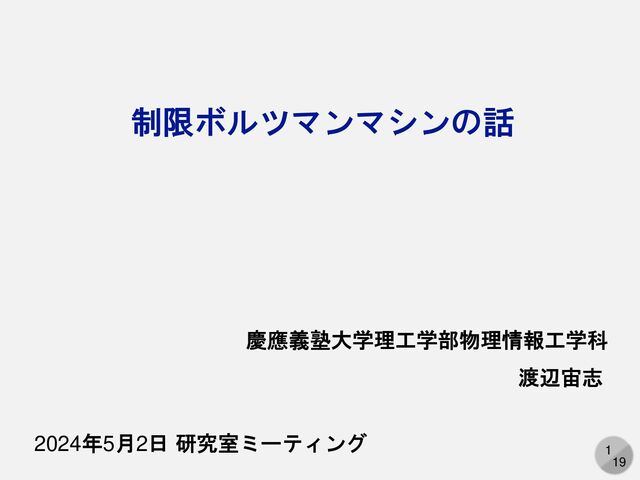 1 19 制限ボルツマンマシンの話 慶應義塾大学理工学部物理情報工学科 渡辺宙志 2024年5月2日 研究室ミーティング