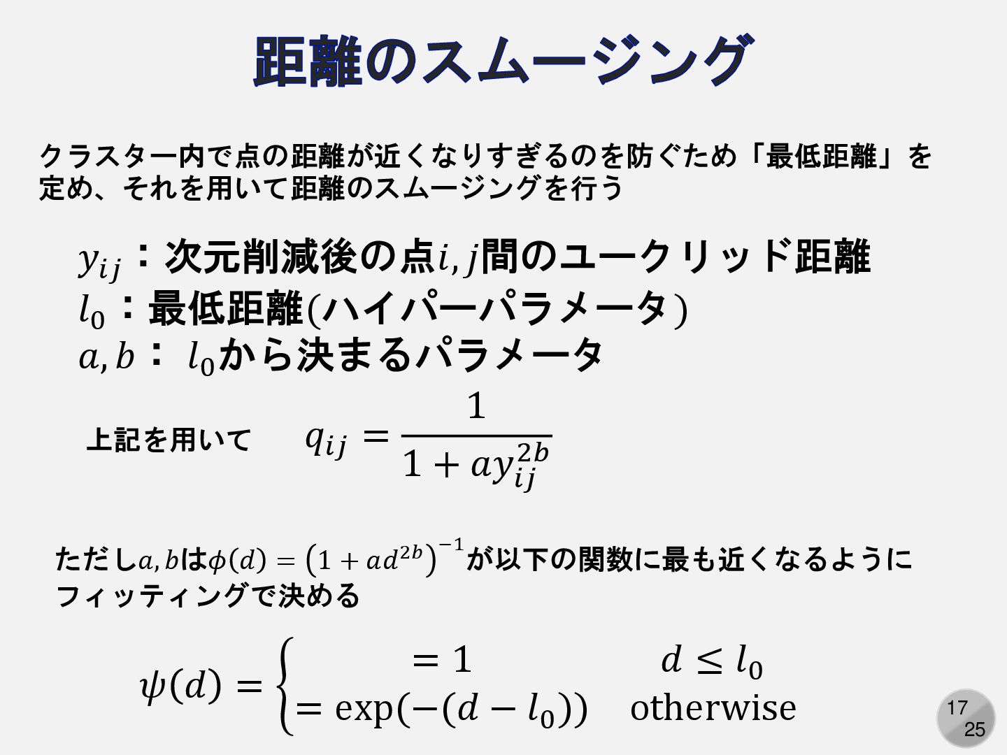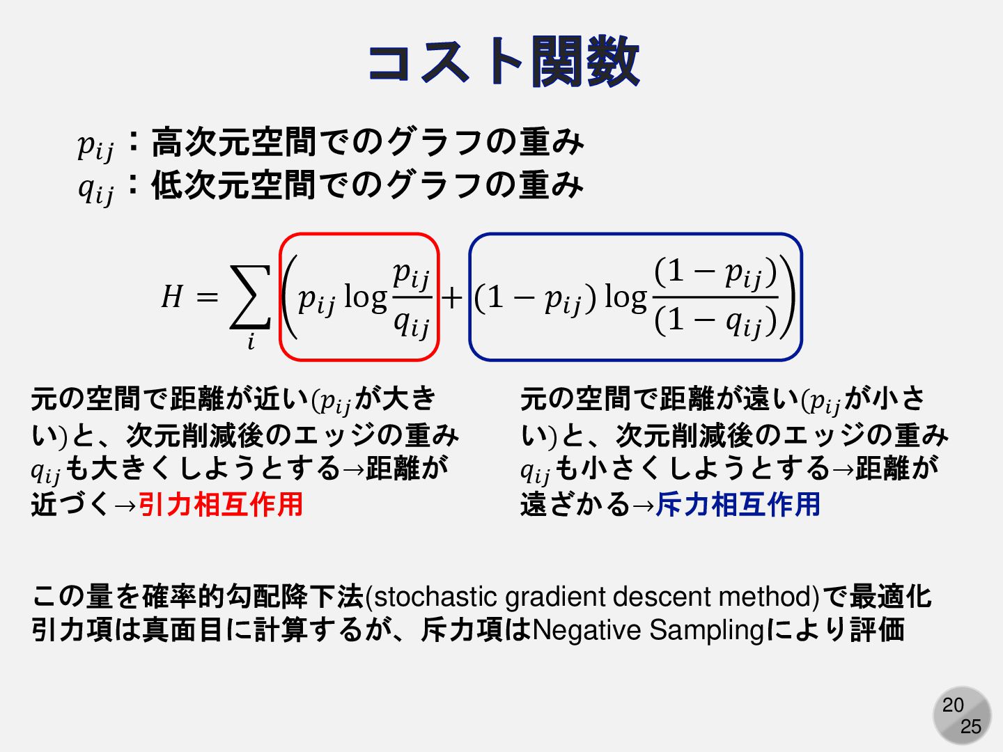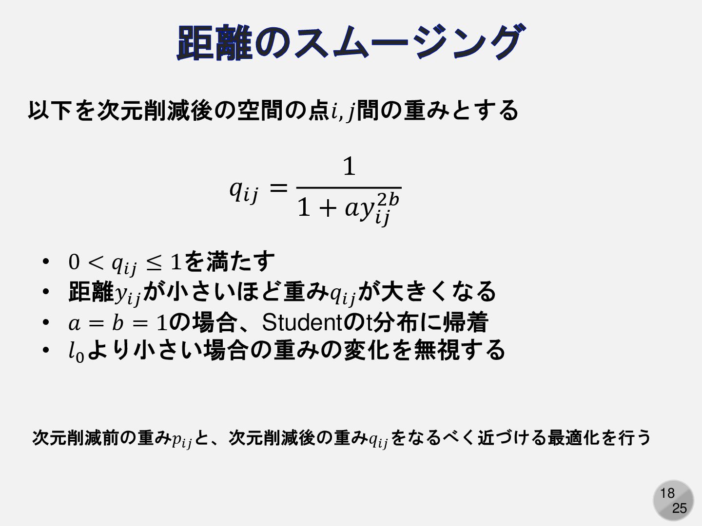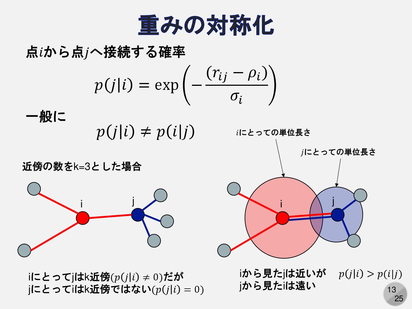 Ԧ 𝑥𝑗 2 /2𝜎𝑖 2) ガウス型 exp(−(𝑟𝑖𝑗 − 𝜌𝑖 )/𝜎𝑖 ) 指数関数型 低次元空間の重み t分布 𝑞𝑖𝑗 ∝ 1 + Ԧ 𝑦𝑖 − Ԧ 𝑦𝑗 2 −1 修正t分布 𝑞𝑖𝑗 ∝ 1 + 𝑎 Ԧ 𝑦𝑖 − Ԧ 𝑦𝑗 2𝑏 −1 𝑝𝑖𝑗 の構築 全データ点ペア 𝑝𝑖𝑗 の意味 点𝑖が近傍として 点𝑗を選ぶ確率 点𝑖, 𝑗間を結ぶエッジが 存在する確率 k個の近傍点についてのみ 対称化 𝑝𝑖𝑗 = 𝑝 𝑗 𝑖 + 𝑝(𝑖|𝑗) 2𝑁 幾何平均 𝑝𝑖𝑗 = 𝑝 𝑗 𝑖 + 𝑝 𝑖 𝑗 − 𝑝 𝑖 𝑗 𝑝 𝑖 𝑗 T-conorm