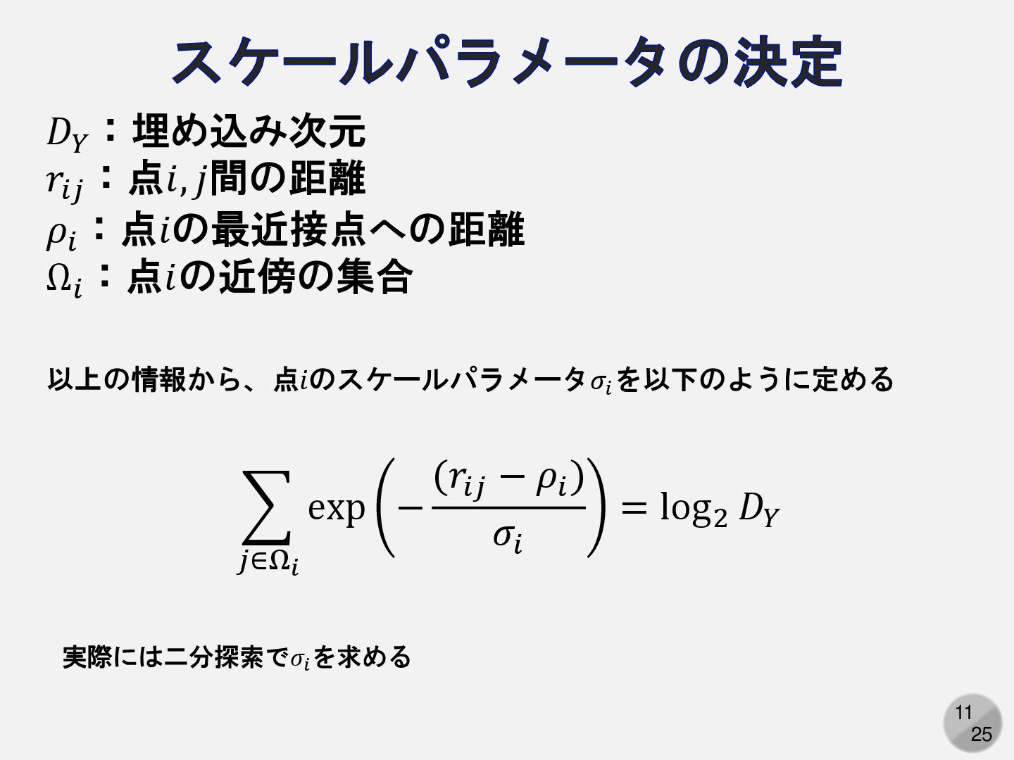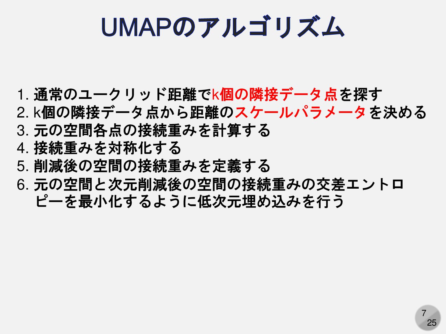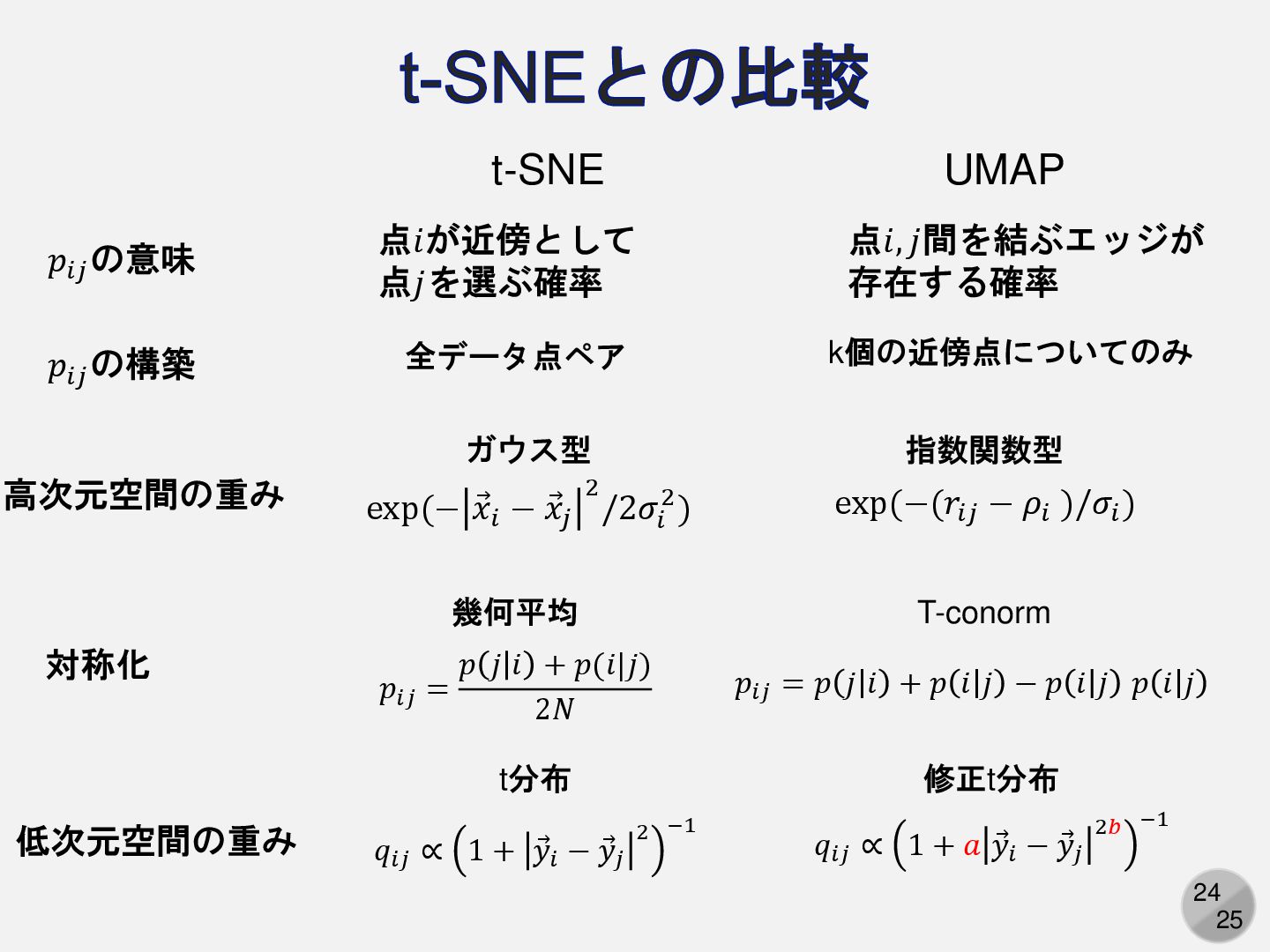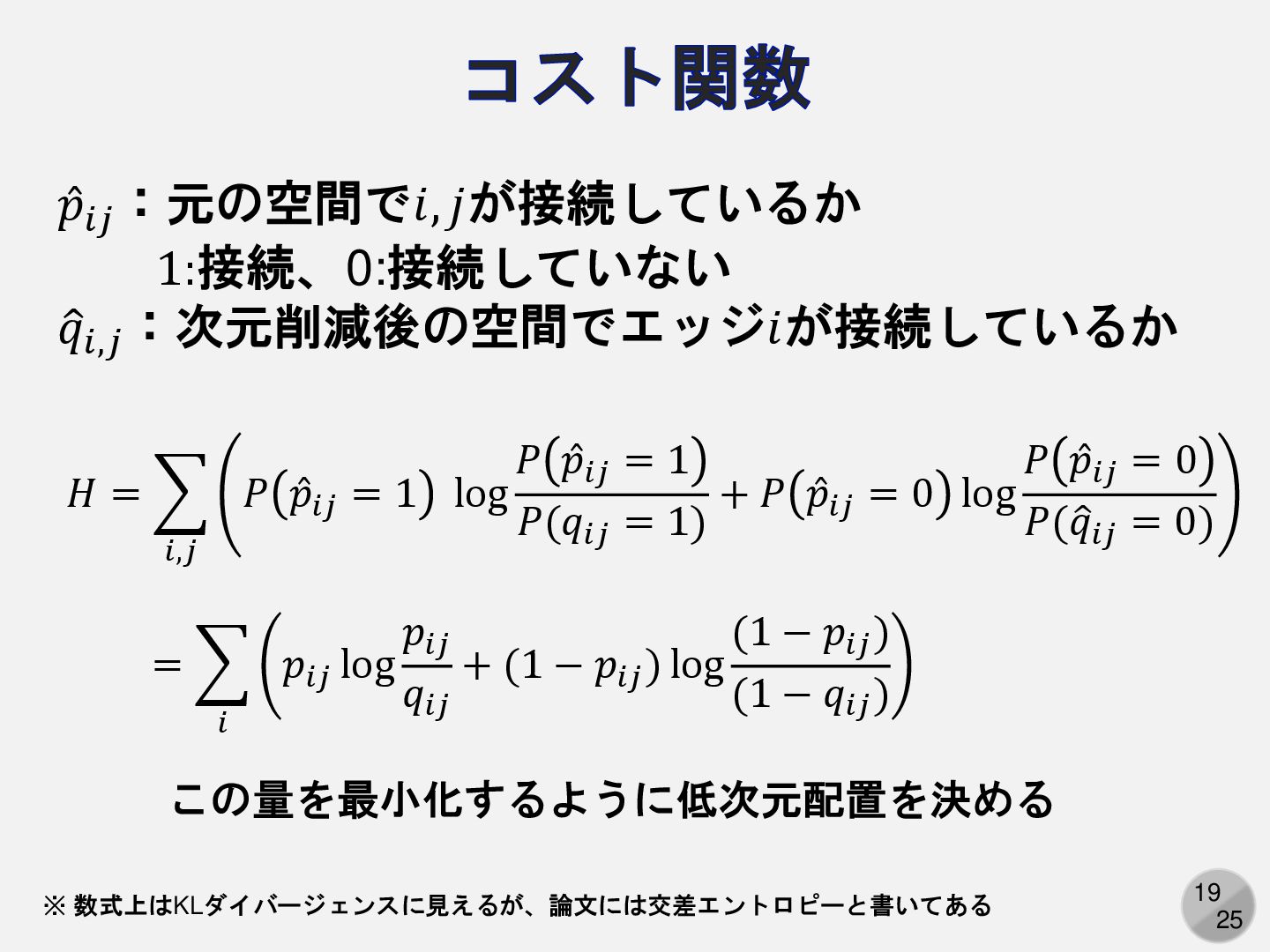 Ԧ 𝑥𝑗 2 /2𝜎𝑖 2) ガウス型 exp(−(𝑟𝑖𝑗 − 𝜌𝑖 )/𝜎𝑖 ) 指数関数型 低次元空間の重み t分布 𝑞𝑖𝑗 ∝ 1 + Ԧ 𝑦𝑖 − Ԧ 𝑦𝑗 2 −1 修正t分布 𝑞𝑖𝑗 ∝ 1 + 𝑎 Ԧ 𝑦𝑖 − Ԧ 𝑦𝑗 2𝑏 −1 𝑝𝑖𝑗 の構築 全データ点ペア 𝑝𝑖𝑗 の意味 点𝑖が近傍として 点𝑗を選ぶ確率 点𝑖, 𝑗間を結ぶエッジが 存在する確率 k個の近傍点についてのみ 対称化 𝑝𝑖𝑗 = 𝑝 𝑗 𝑖 + 𝑝(𝑖|𝑗) 2𝑁 幾何平均 𝑝𝑖𝑗 = 𝑝 𝑗 𝑖 + 𝑝 𝑖 𝑗 − 𝑝 𝑖 𝑗 𝑝 𝑖 𝑗 T-conorm