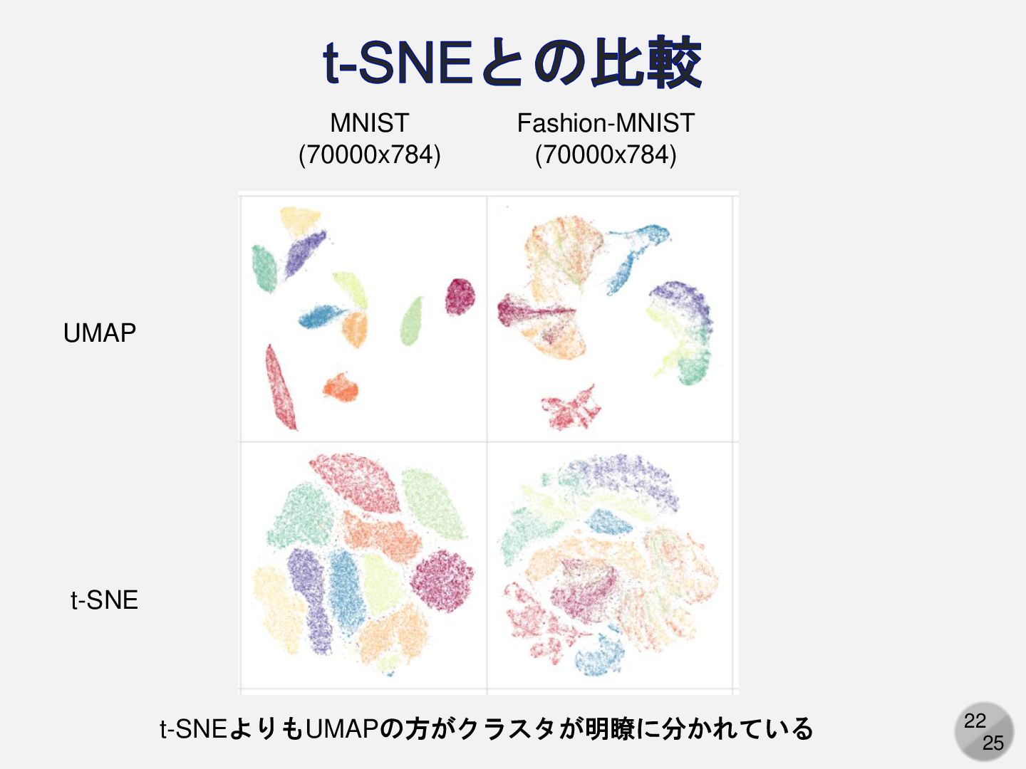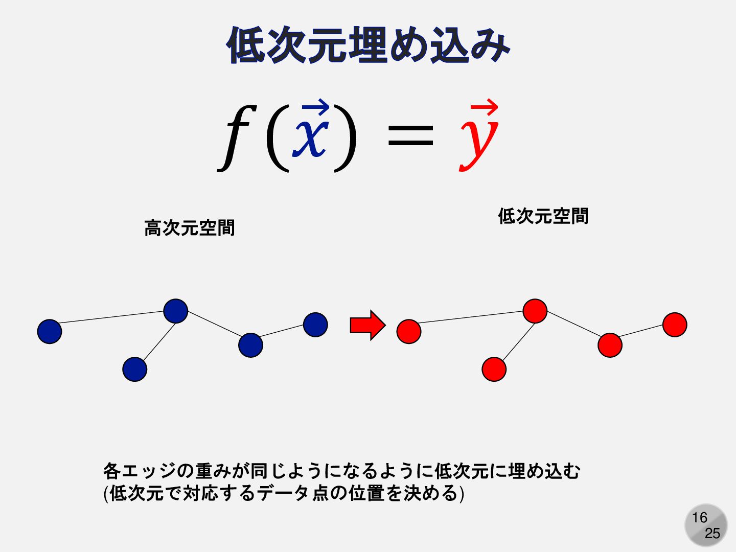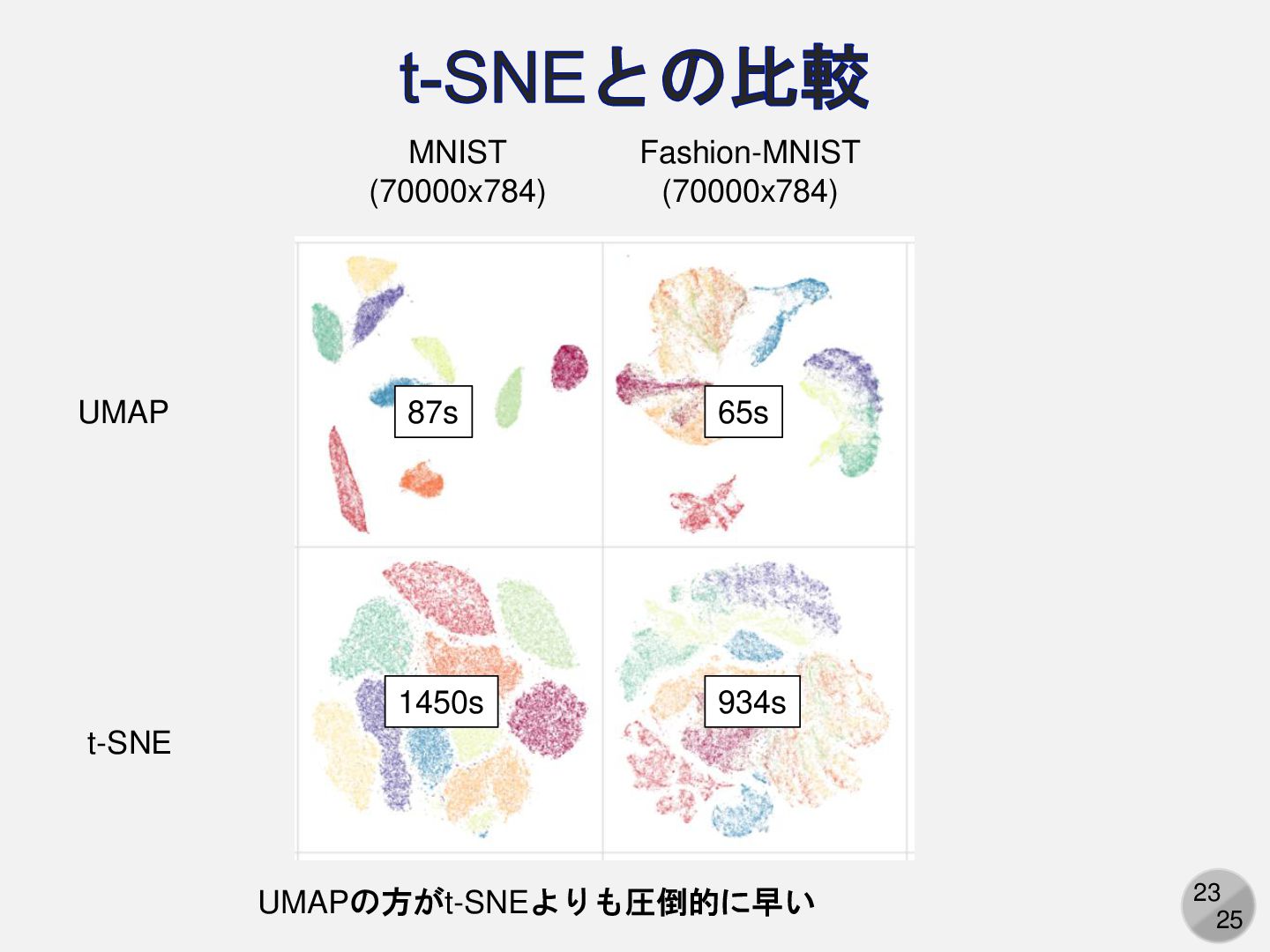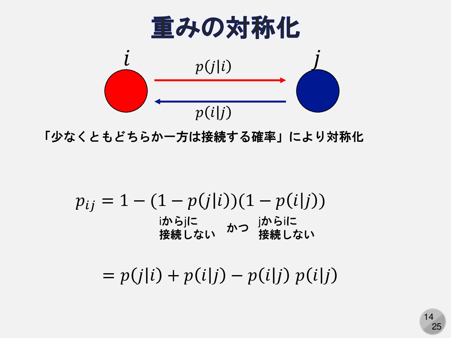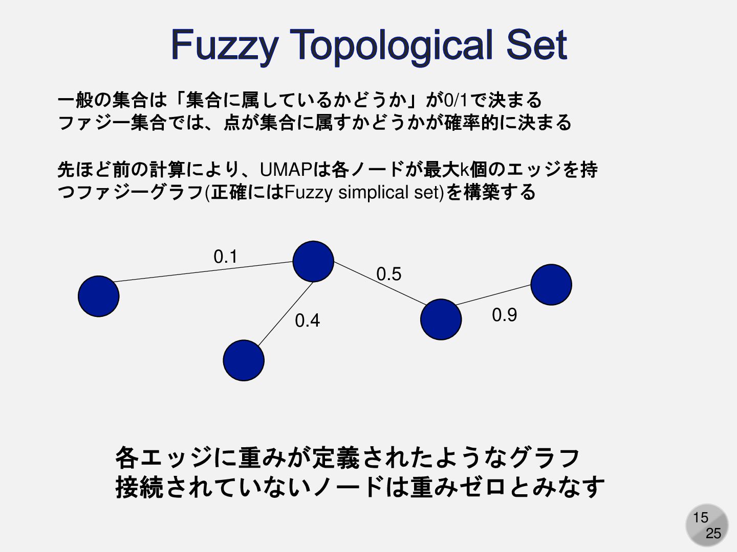 Ԧ 𝑥𝑗 2 /2𝜎𝑖 2) ガウス型 exp(−(𝑟𝑖𝑗 − 𝜌𝑖 )/𝜎𝑖 ) 指数関数型 低次元空間の重み t分布 𝑞𝑖𝑗 ∝ 1 + Ԧ 𝑦𝑖 − Ԧ 𝑦𝑗 2 −1 修正t分布 𝑞𝑖𝑗 ∝ 1 + 𝑎 Ԧ 𝑦𝑖 − Ԧ 𝑦𝑗 2𝑏 −1 𝑝𝑖𝑗 の構築 全データ点ペア 𝑝𝑖𝑗 の意味 点𝑖が近傍として 点𝑗を選ぶ確率 点𝑖, 𝑗間を結ぶエッジが 存在する確率 k個の近傍点についてのみ 対称化 𝑝𝑖𝑗 = 𝑝 𝑗 𝑖 + 𝑝(𝑖|𝑗) 2𝑁 幾何平均 𝑝𝑖𝑗 = 𝑝 𝑗 𝑖 + 𝑝 𝑖 𝑗 − 𝑝 𝑖 𝑗 𝑝 𝑖 𝑗 T-conorm