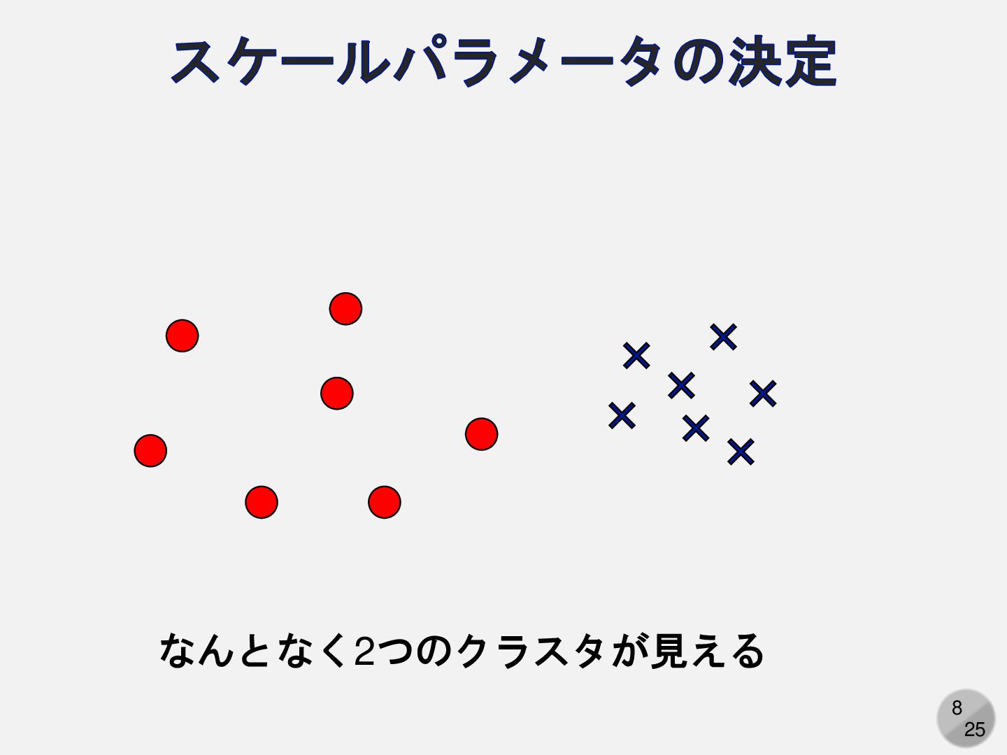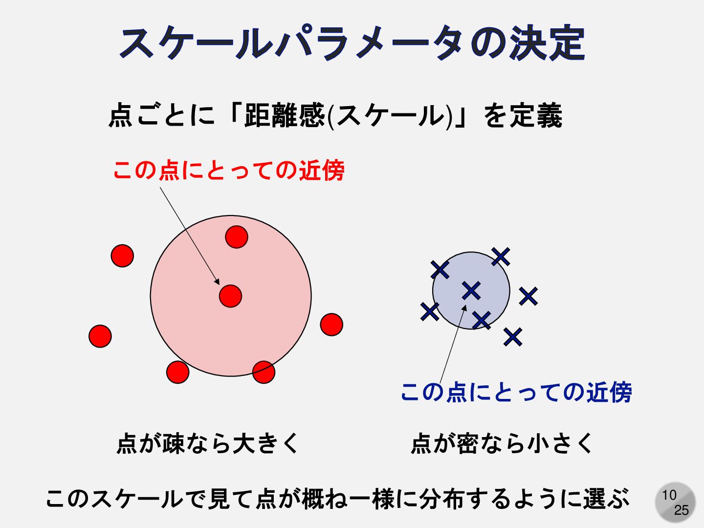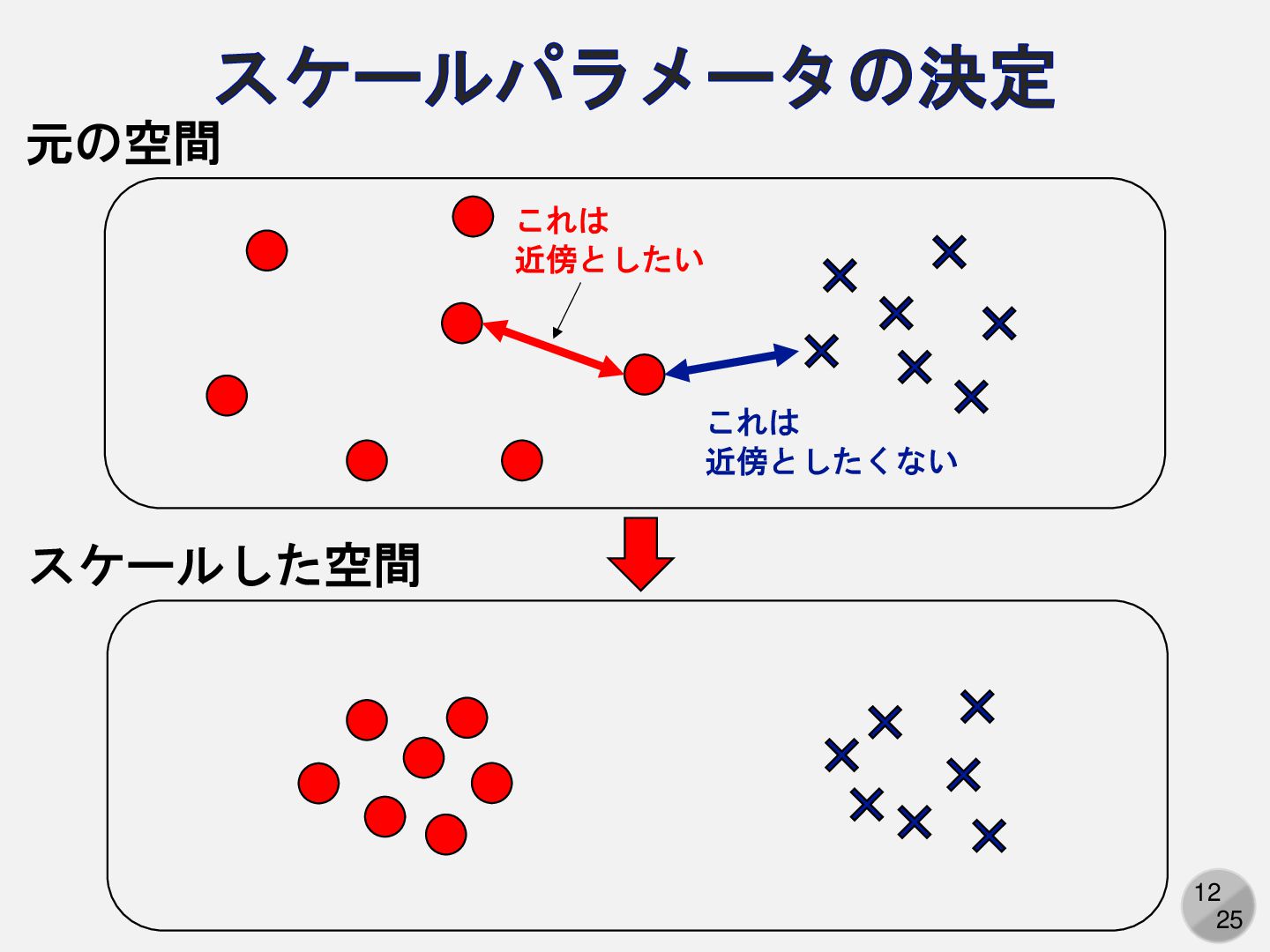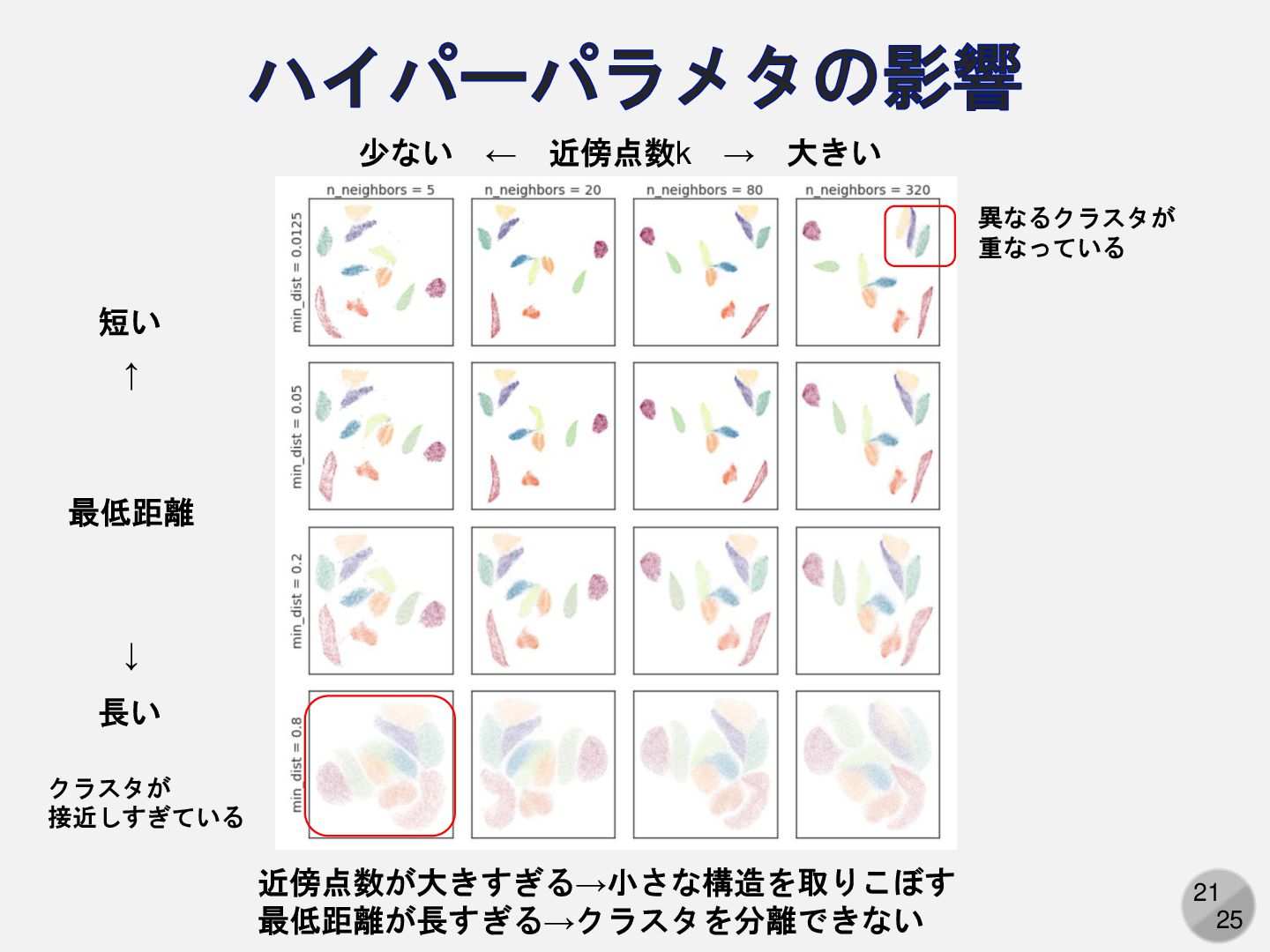 Ԧ 𝑥𝑗 2 /2𝜎𝑖 2) ガウス型 exp(−(𝑟𝑖𝑗 − 𝜌𝑖 )/𝜎𝑖 ) 指数関数型 低次元空間の重み t分布 𝑞𝑖𝑗 ∝ 1 + Ԧ 𝑦𝑖 − Ԧ 𝑦𝑗 2 −1 修正t分布 𝑞𝑖𝑗 ∝ 1 + 𝑎 Ԧ 𝑦𝑖 − Ԧ 𝑦𝑗 2𝑏 −1 𝑝𝑖𝑗 の構築 全データ点ペア 𝑝𝑖𝑗 の意味 点𝑖が近傍として 点𝑗を選ぶ確率 点𝑖, 𝑗間を結ぶエッジが 存在する確率 k個の近傍点についてのみ 対称化 𝑝𝑖𝑗 = 𝑝 𝑗 𝑖 + 𝑝(𝑖|𝑗) 2𝑁 幾何平均 𝑝𝑖𝑗 = 𝑝 𝑗 𝑖 + 𝑝 𝑖 𝑗 − 𝑝 𝑖 𝑗 𝑝 𝑖 𝑗 T-conorm