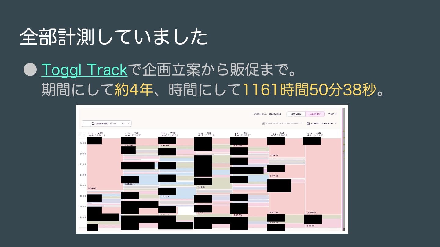 プロトタイピングから販促まで、合計1161時間50分38秒かかった。