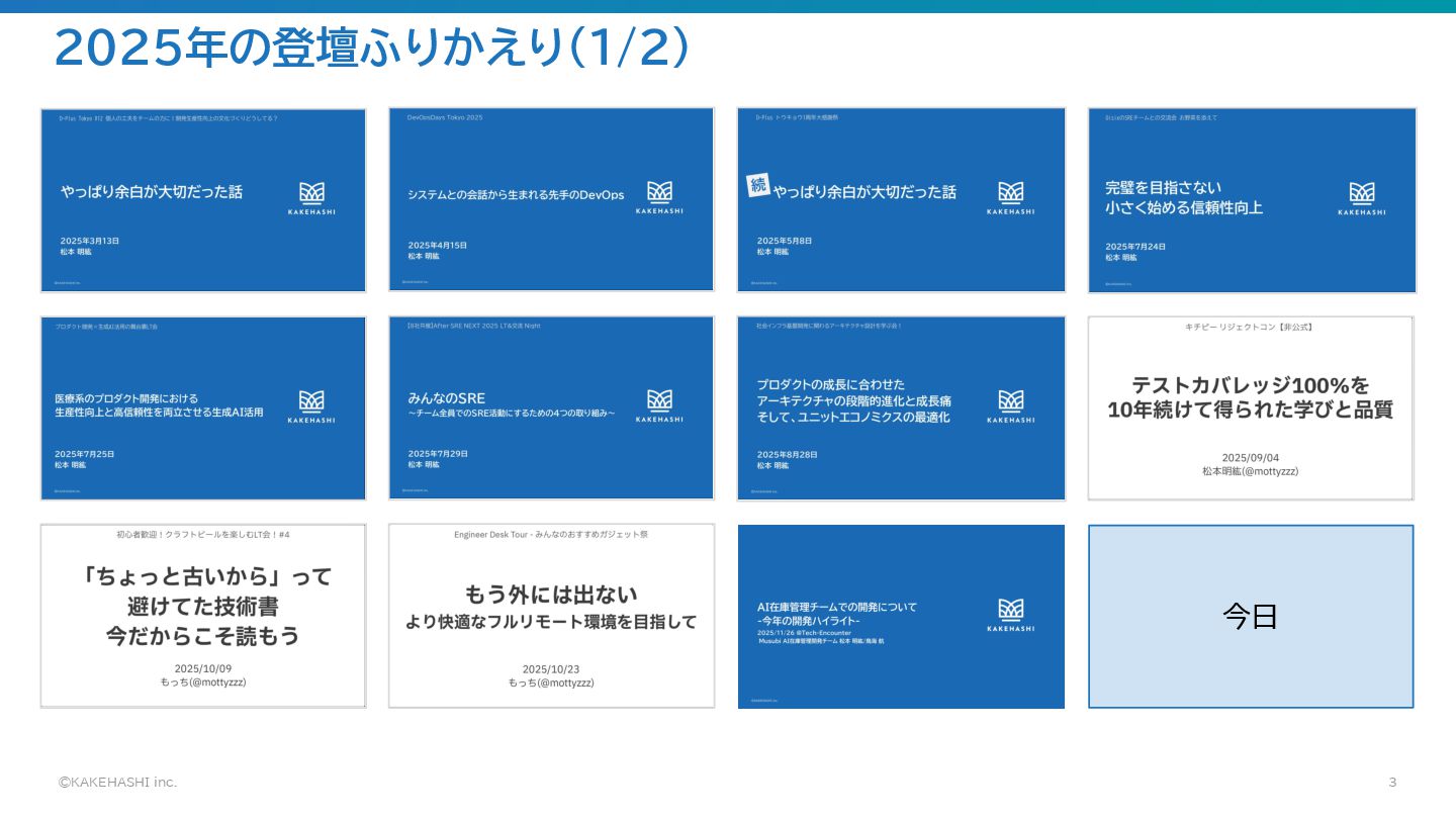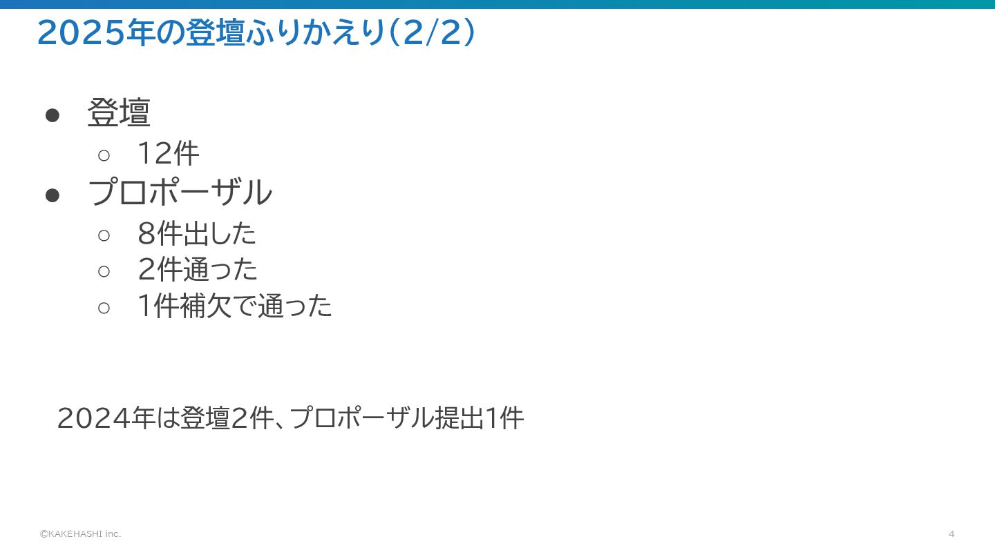 1. ©KAKEHASHI inc. 4 2025年の登壇ふりかえり(2/2) • 登壇 ◦ 12件 • プロポーザル