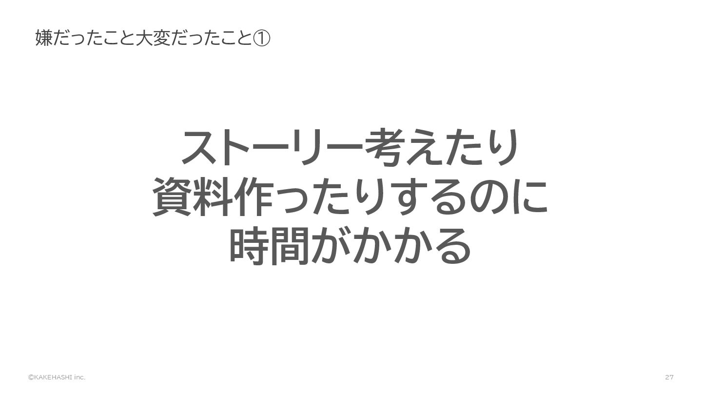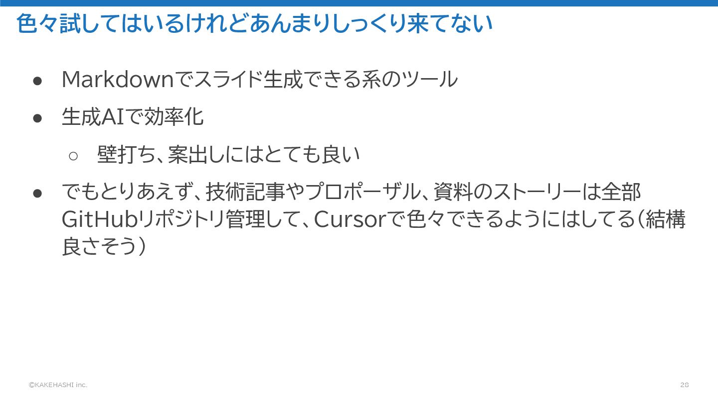 2. ©KAKEHASHI inc. 色々試してはいるけれどあんまりしっくり来てない 28 • Markdownでスライド生成できる系のツール • 生成AIで効率化 ◦ 壁打ち、案出しにはとても良い
