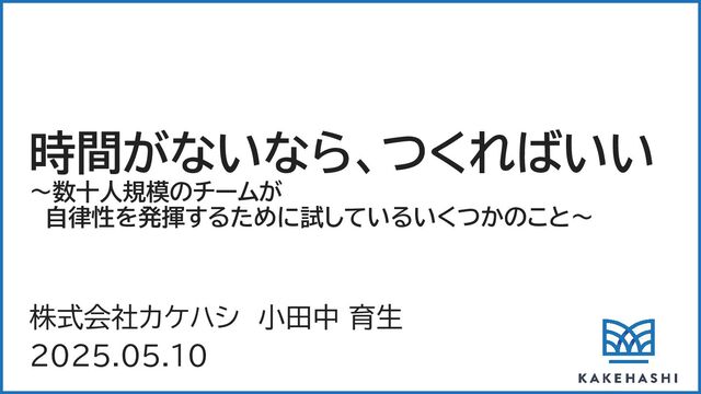 © KAKEHASHI Inc. 時間がないなら、つくればいい 物理的に時間がないなら、まずそれを確保する 生まれた余白をチームで有効活用したいなら、 全体最適に向けて働きかける チームは生き物。うまくいったプラクティスが、 ある局面ではうまくハマらないこともある。 だからこそメンバーが主体的に動く、組織としての余白が必要