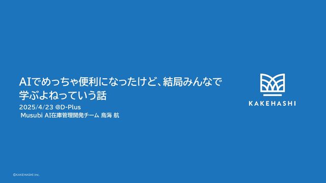 ©KAKEHASHI inc. AIでめっちゃ便利になったけど、結局みんなで 学ぶよねっていう話 2025/4/23 @D-Plus Musubi AI在庫管理開発チーム 鳥海 航