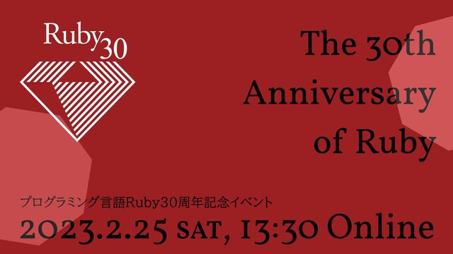 プログラミング言語Ruby30周年記念イベント https://30.ruby.or.jp/ https://www.youtube.com/watch?v=cmd5NdMjHkI イベント前後の反応: https://twitter.com/search?q=%23ruby30th