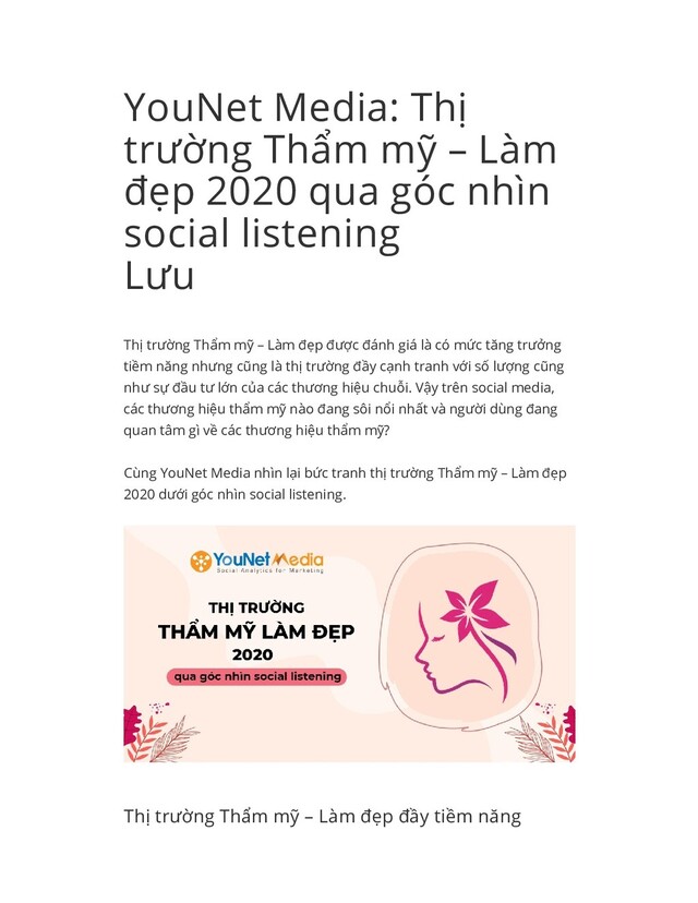 là có mức tăng trưởng tiềm năng nhưng cũng là thị trường đầy cạnh tranh với số lượng cũng như sự đầu tư lớn của các thương hiệu chuỗi. Vậy trên social media, các thương hiệu thẩm mỹ nào đang sôi nổi nhất và người dùng đang quan tâm gì về các thương hiệu thẩm mỹ? Cùng YouNet Media nhìn lại bức tranh thị trường Thẩm mỹ – Làm đẹp 2020 dưới góc nhìn social listening. Thị trường Thẩm mỹ – Làm đẹp đầy tiềm năng YouNet Media: Thị trường Thẩm mỹ – Làm đẹp 2020 qua góc nhìn social listening Lưu