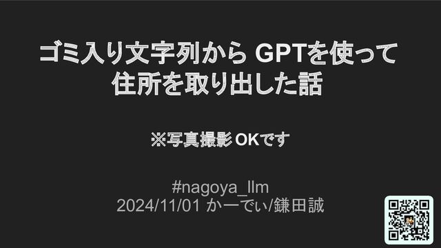 ゴミ入り文字列から GPTを使って 住所を取り出した話 ※写真撮影 OKです #nagoya_llm 2024/11/01 かーでぃ/鎌田誠