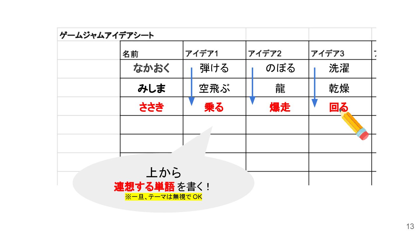 連想する単語 を書く! ※一旦、テーマは無視で OK 13 ささき 乗る 爆走 回る