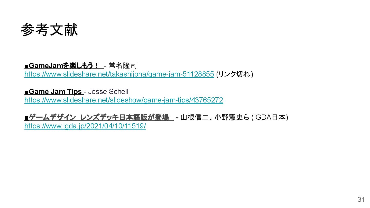 Schell https://www.slideshare.net/slideshow/game-jam-tips/43765272 ▪ゲームデザイン レンズデッキ日本語版が登場 - 山根信二、小野憲史ら (IGDA日本) https://www.igda.jp/2021/04/10/11519/ 参考文献 31