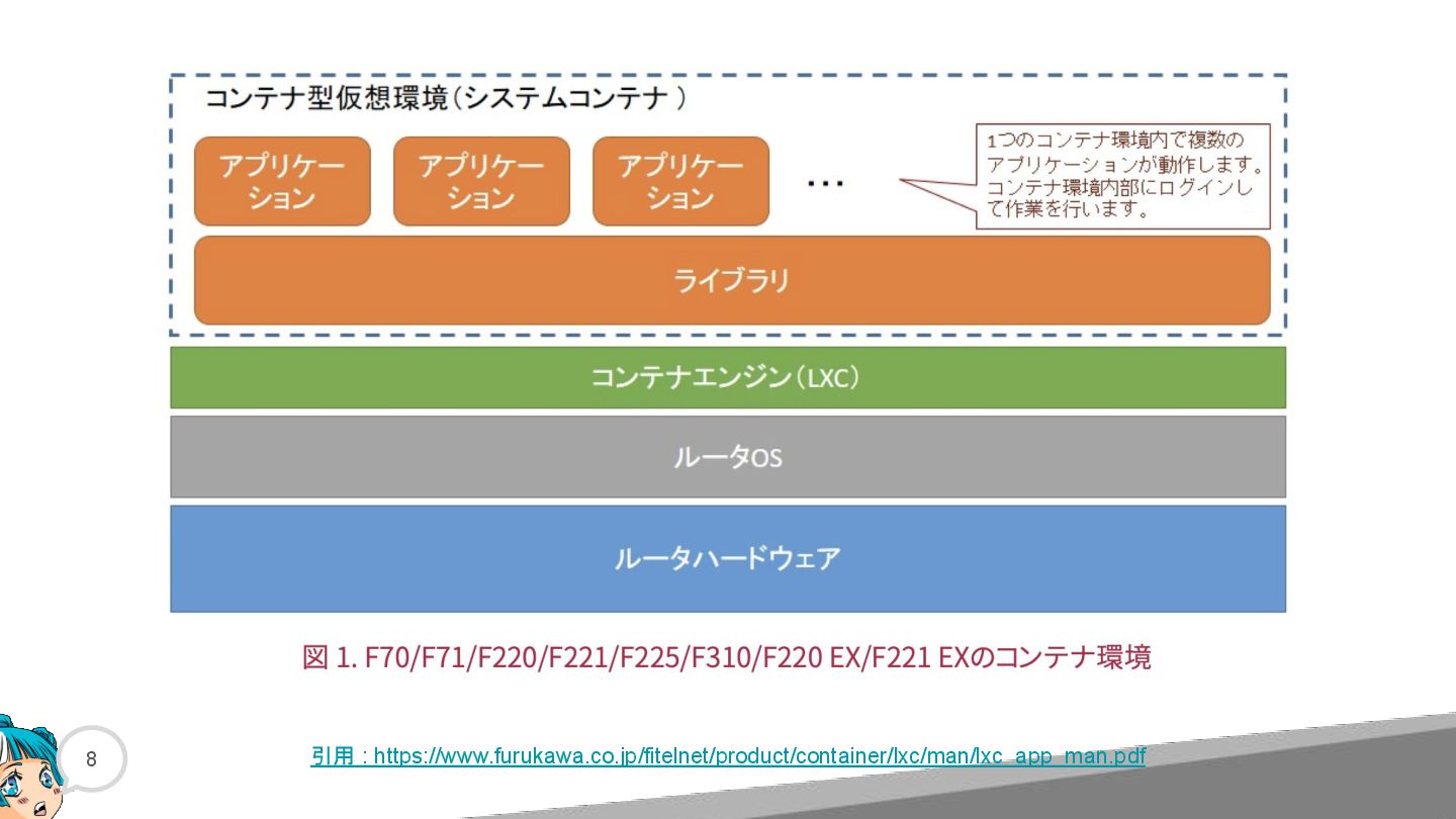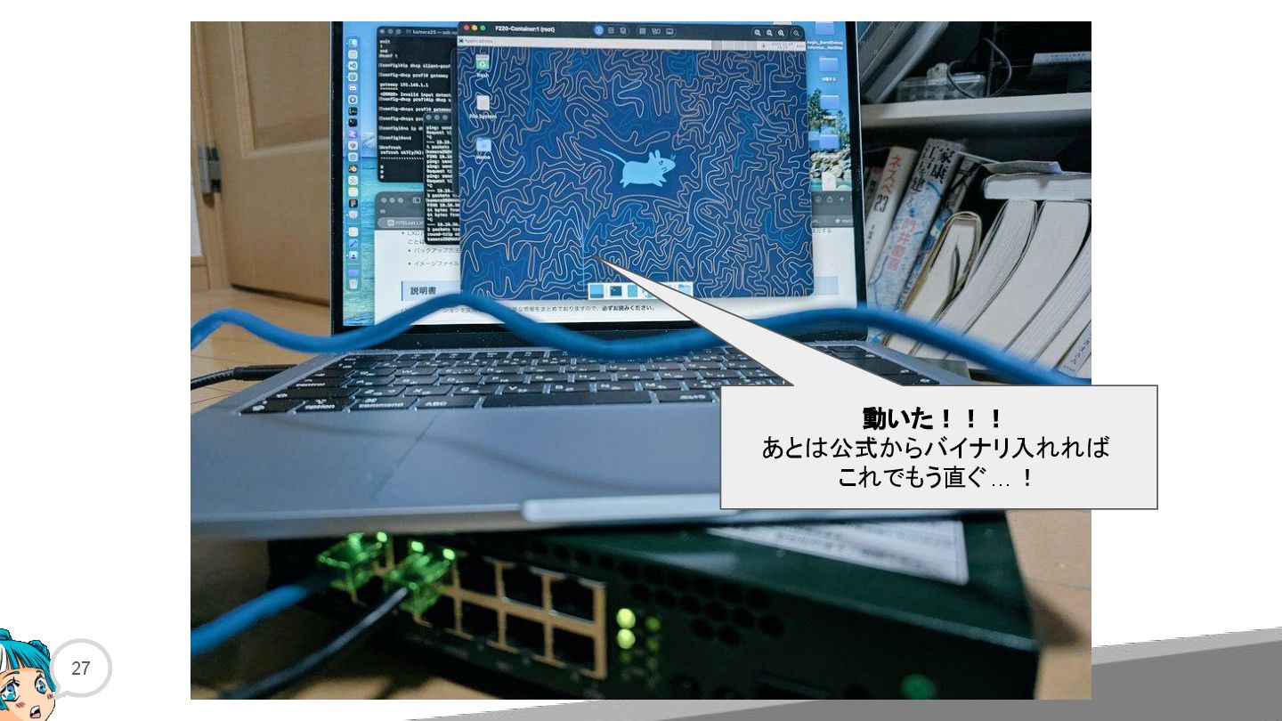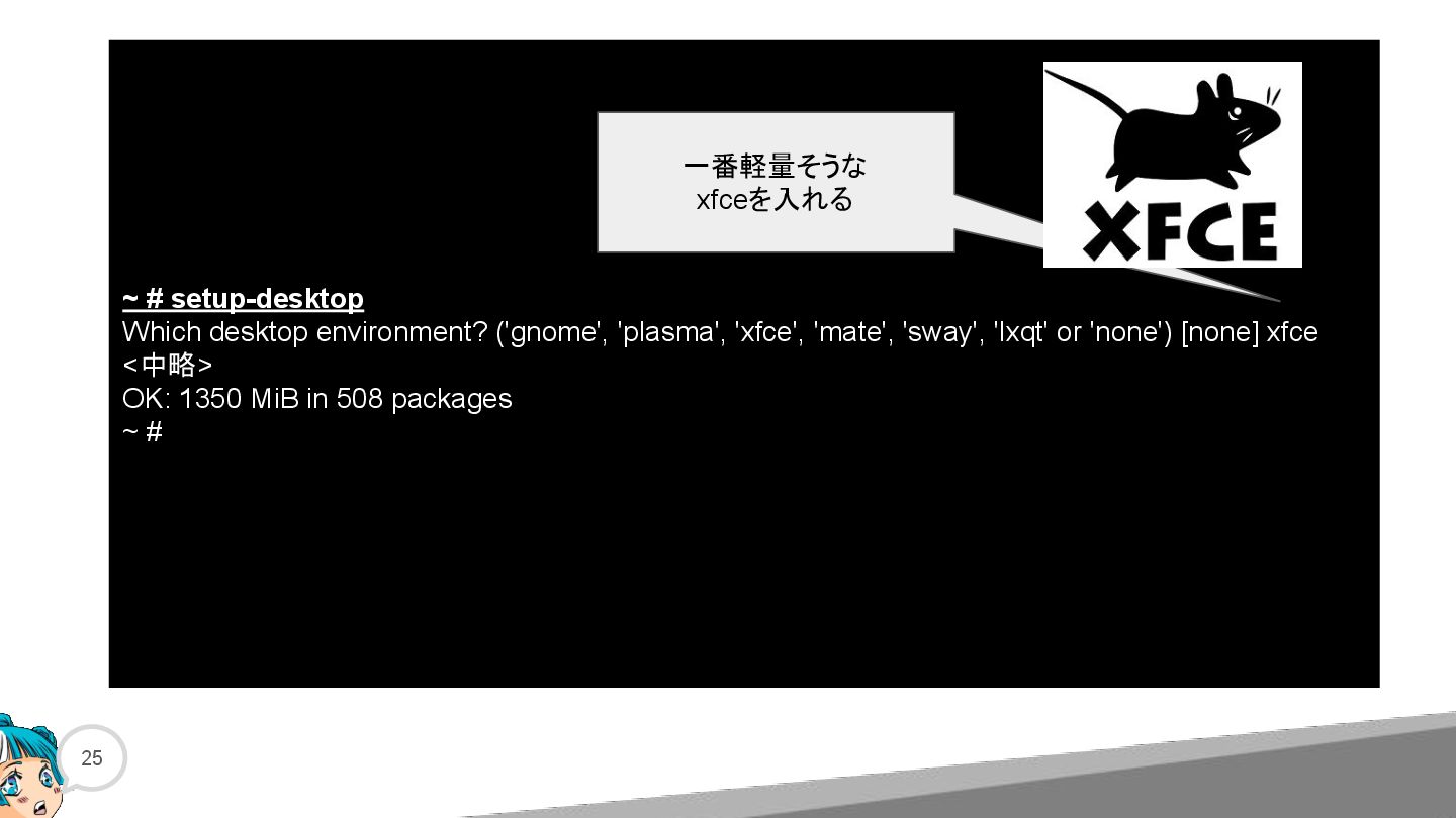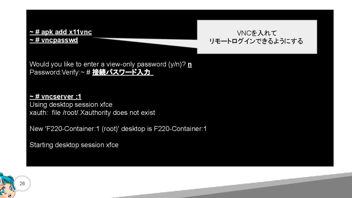 you like to enter a view-only password (y/n)? n Password:Verify:~ # 接続パスワード入力 ~ # vncserver :1 Using desktop session xfce xauth: file /root/.Xauthority does not exist New 'F220-Container:1 (root)' desktop is F220-Container:1 Starting desktop session xfce VNCを入れて リモートログインできるようにする