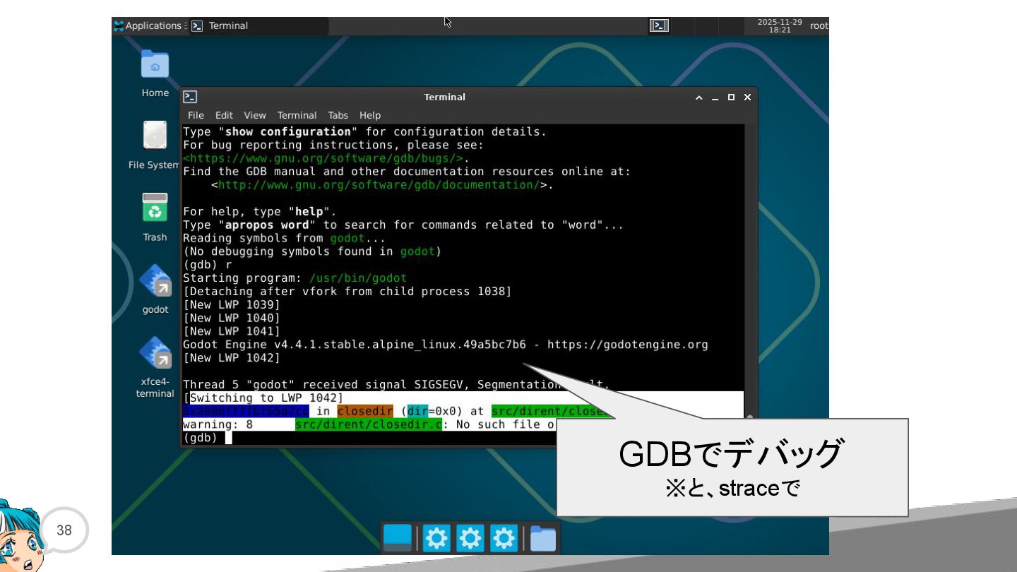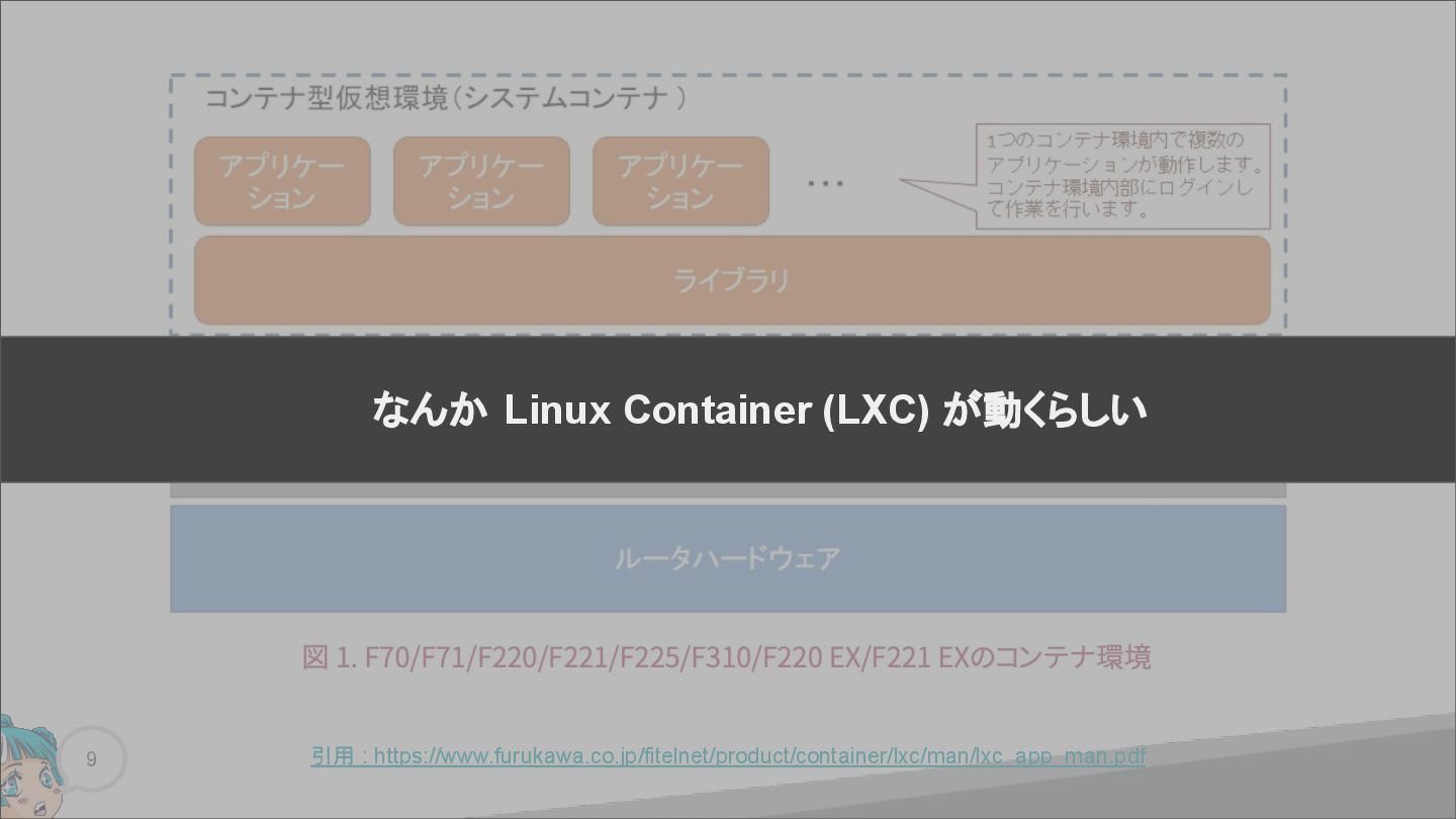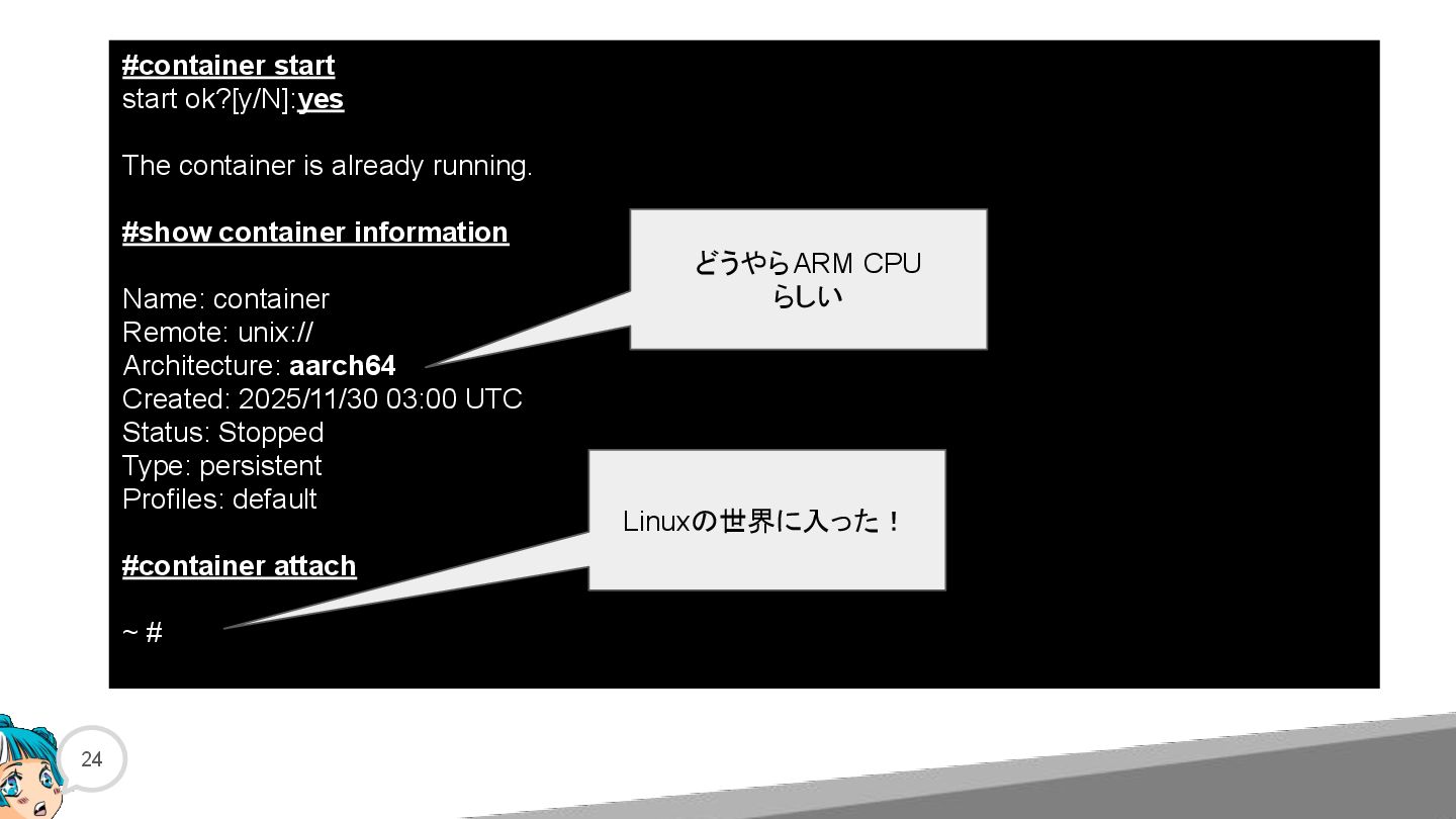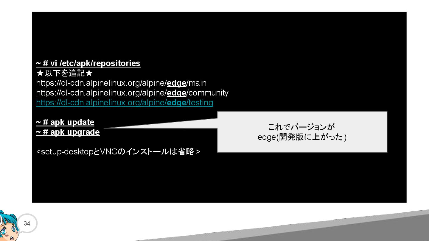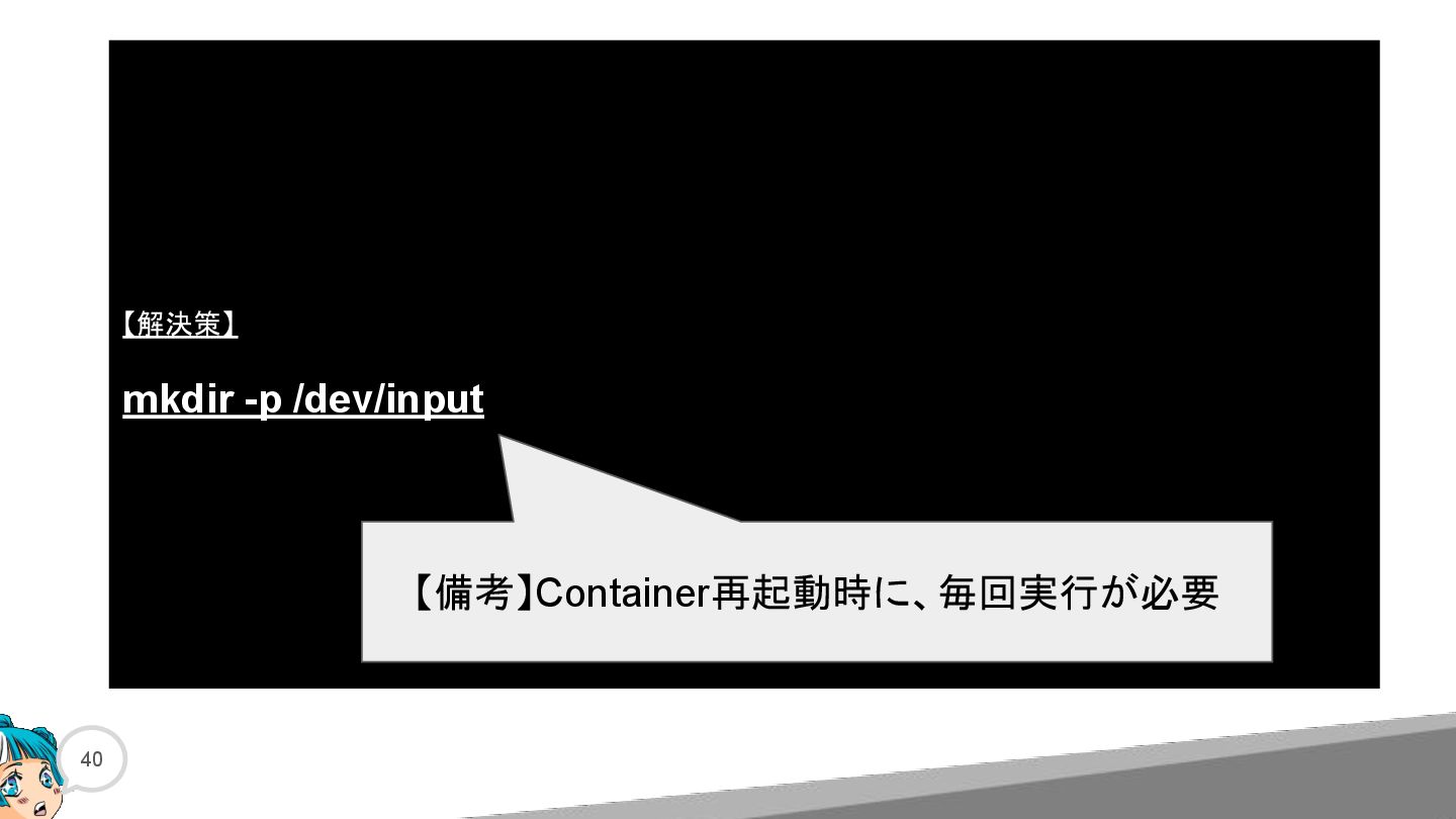 you like to enter a view-only password (y/n)? n Password:Verify:~ # 接続パスワード入力 ~ # vncserver :1 Using desktop session xfce xauth: file /root/.Xauthority does not exist New 'F220-Container:1 (root)' desktop is F220-Container:1 Starting desktop session xfce VNCを入れて リモートログインできるようにする